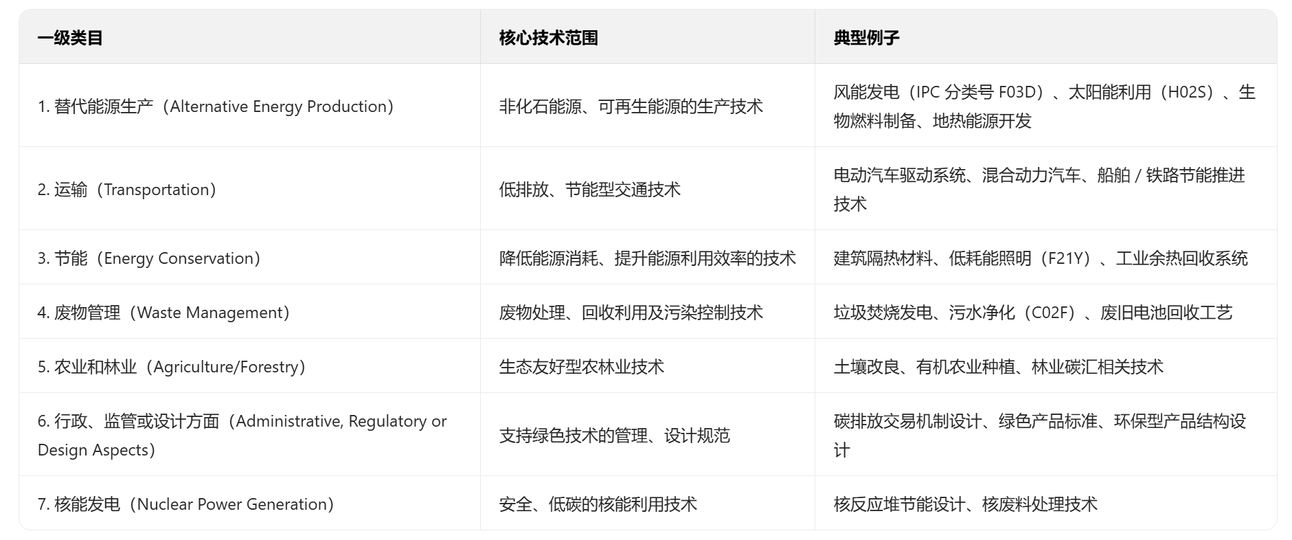 WIPO 将绿色专利划分为7 个一级技术类目,每个类目下包含二级、三级、四级细分主题,共覆盖约 200 个与环境无害化技术直接相关的领域,且每个主题都与特定的 IPC 分类号挂钩(便于精准检索)。具体一级类目及核心范围如下:
