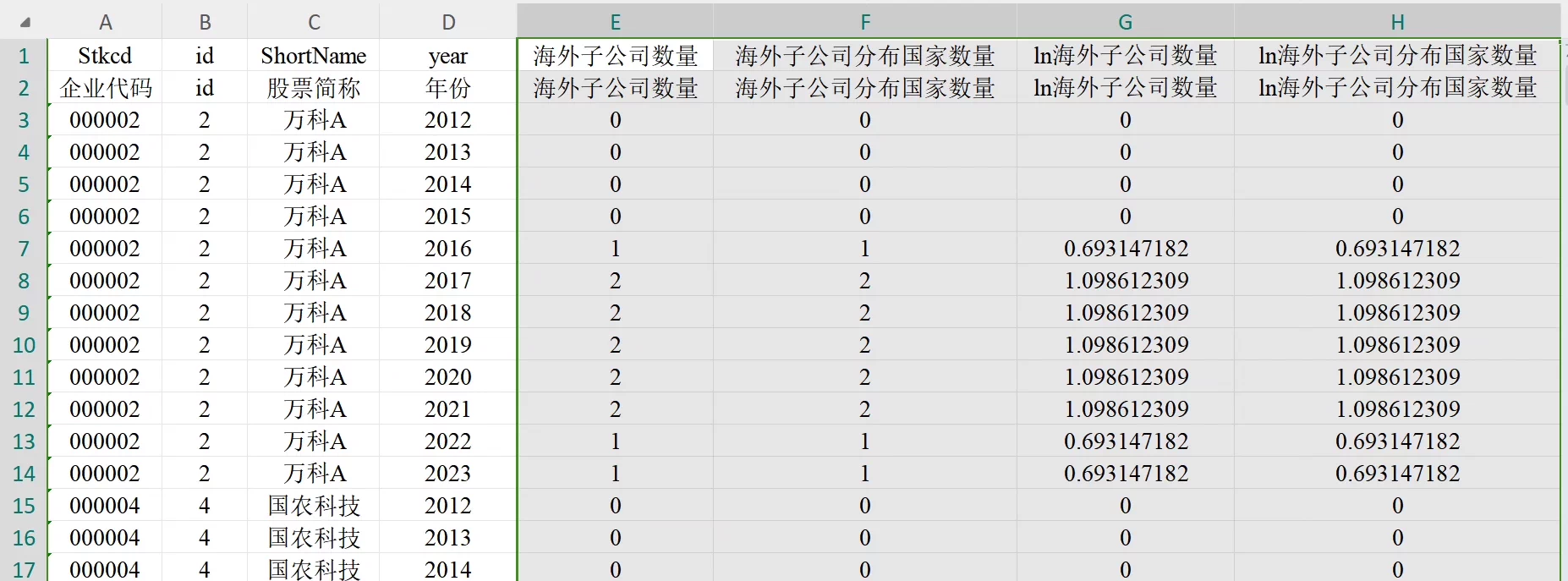 ln海外子公司数量:海外子公司数量加一取自然对数