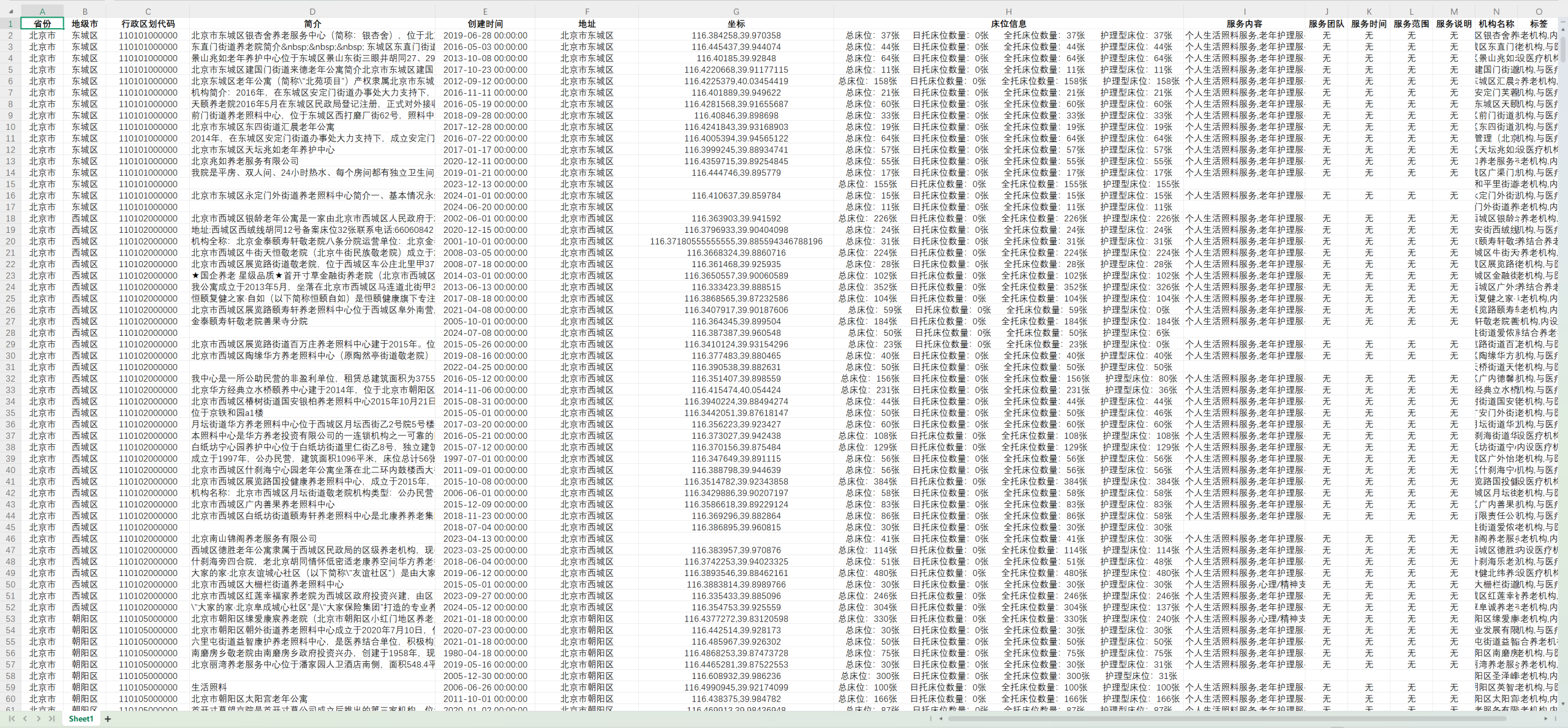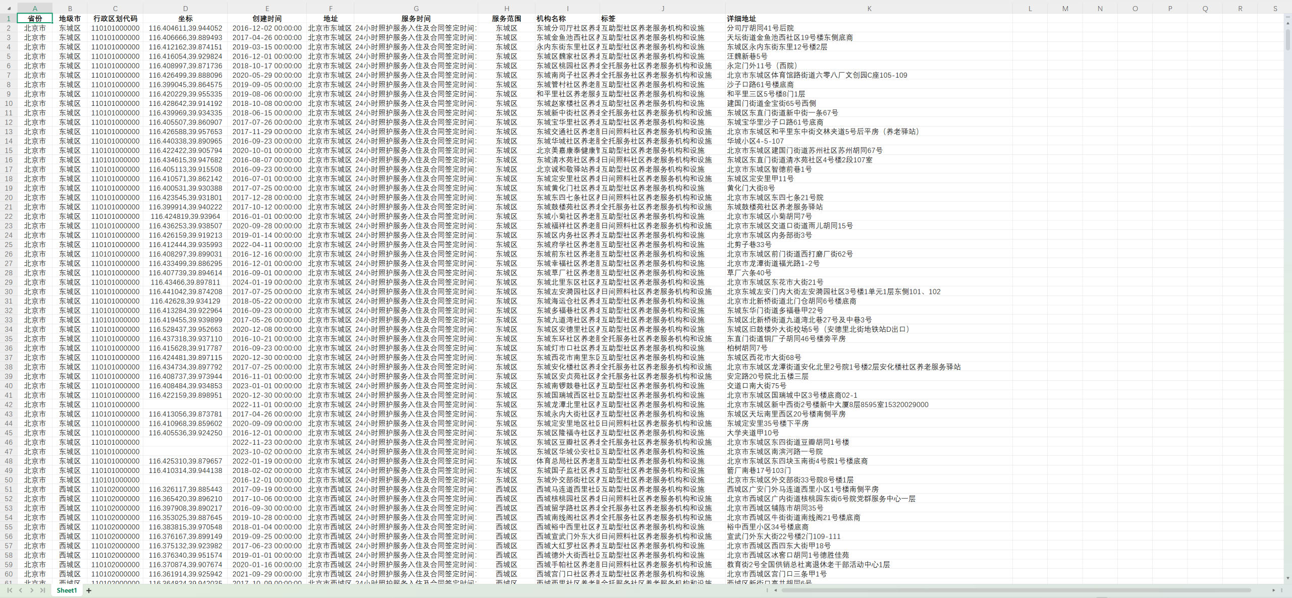 2.社区养老字段:省份、行政区划代码、地级市、坐标、创建时间、地址、服务时间、服务范围、机构名称、标签、详细地址。