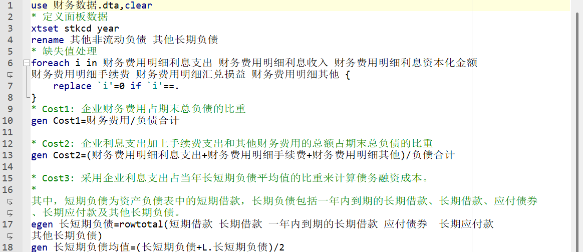 共2个版本,一个未剔除,一个剔除金融及ST、PT企业。 多种方式有助于调试结果,也可用于稳健性检验,包括原始数据、代码、最终数据、参考文献。 Cost1:企业财务费用占期末总负债的比重 Cost2:采用企业利息支出占当年长短期负债平均值的比重来计算债务融资成本。 Cost3:采用企业利息支出占当年长短期负债平均值的比重来计算债务融资成本。 其中,短期负债为资产负债表中的短期借款,长期负债包括一年内到期的长期借款、长期借款、应付债券、长期应付款及其他长期负债。