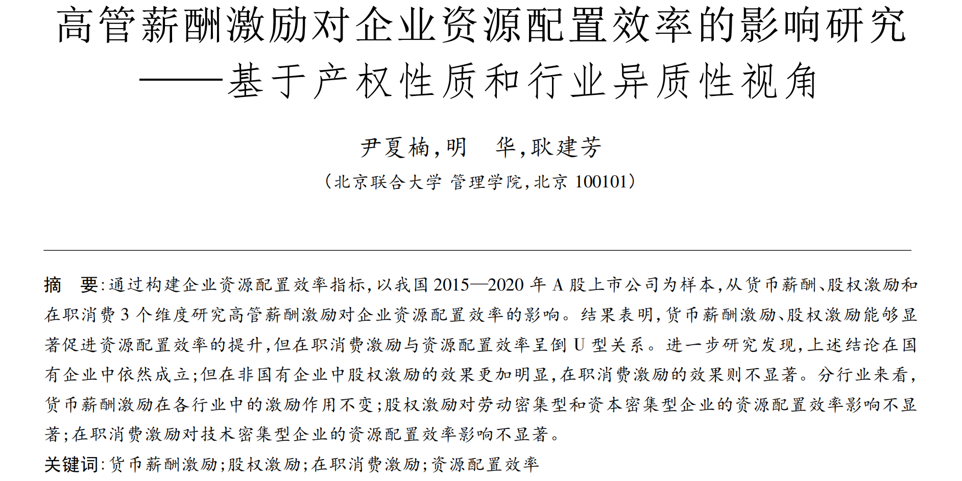 [1]尹夏楠,明华,耿建芳.高管薪酬激励对企业资源配置效率的影响研究——基于产权性质和行业异质性视角[J].中国软科学, 2021(S01):8. 货币激励 =1n (高管前三名薪酬总额) 股权激励 =1n (高管持股数) 在职消费激励=管理费用/营业收入