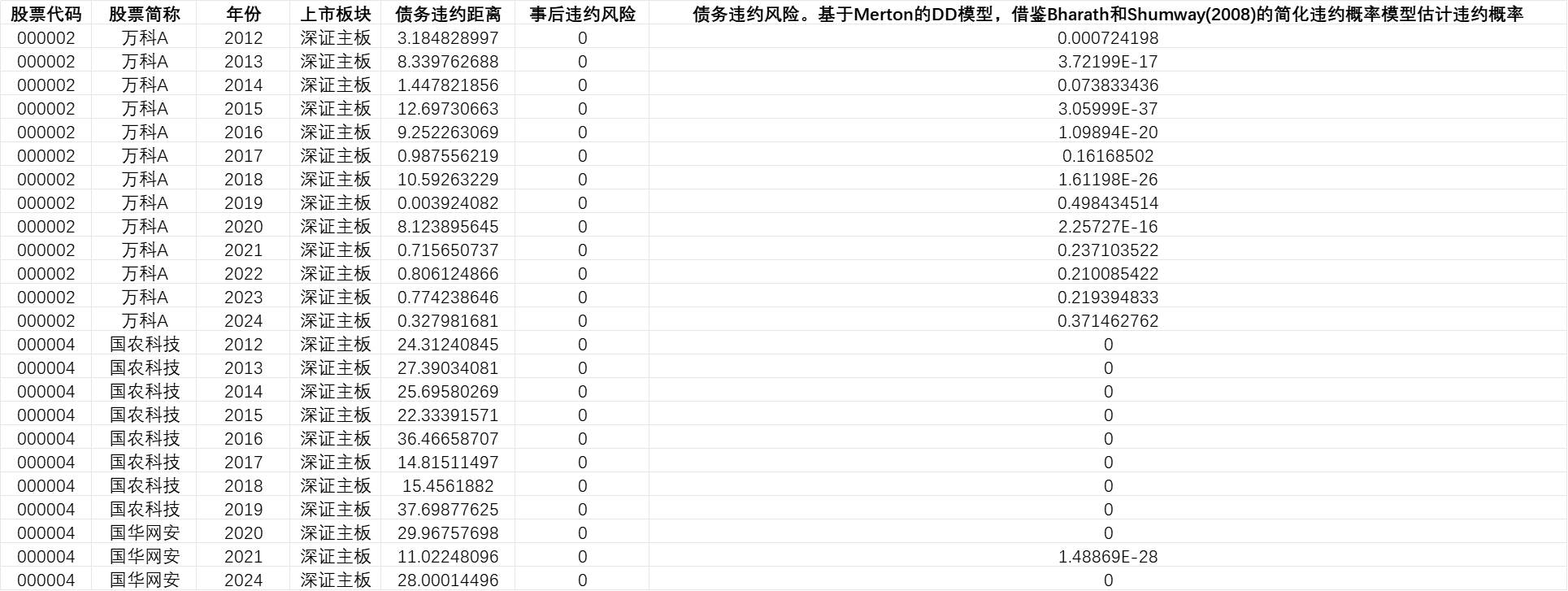 参考了《财经论丛》《世界经济》等文献,基于 Merton 的DD模型,借鉴Bharath和Shumway(2008)的简化概率模型估计违约概率(EDF)衡量企业债务违约风险。 DD:债务违约距离; EDF:债务违约风险。基于Merton的DD模型,借鉴Bharath和Shumway(2008)的简化违约概率模型估计违约概率; Violate:事后违约风险,若上年短期借款大于当期偿还借款额度为1,代表公司未按期偿还,否则为0;