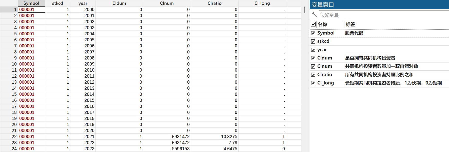 Cl_long长短期共同机构投资者持股:连续持股 4 个季度以上的共同机构投资者定义为长期,否则为短期。其是在共同投资者基础上再进行划分,所以样本量较少,5750个。