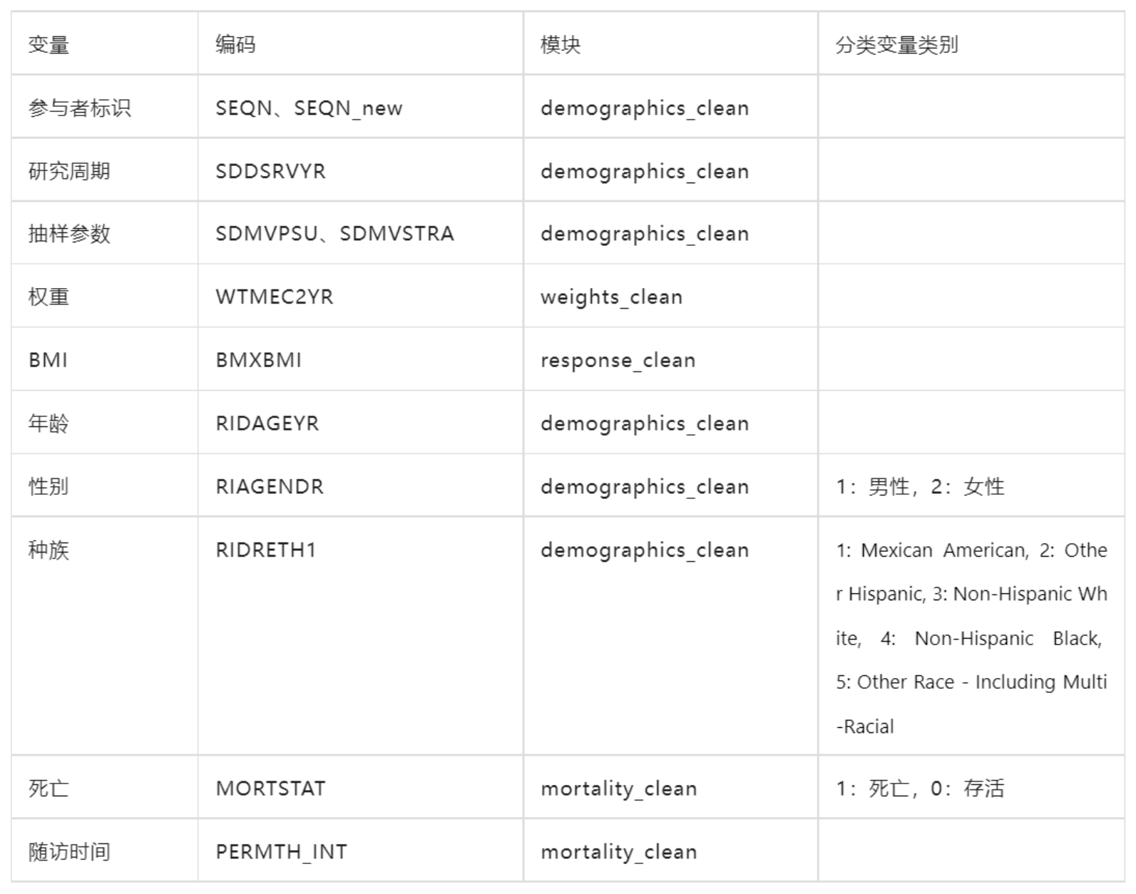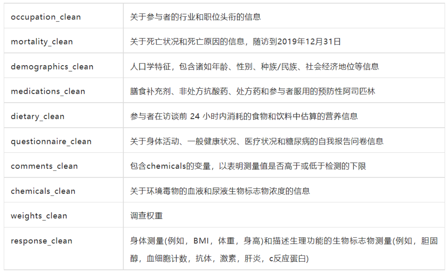 – 公开数据:包括人口统计学、问卷调查、体检及基础实验室数据(如血常规、血脂),可通过NCHS官网免费下载,格式为SAS .XPT或CSV。