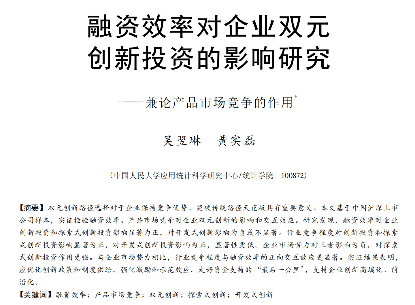 [1]吴翌琳,黄实磊.融资效率对企业双元创新投资的影响研究——兼论产品市场竞争的作用[J].会计研究,2021,(12):121-135.