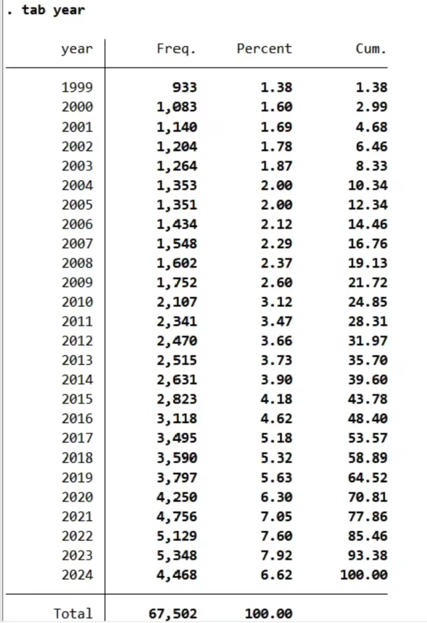 Pledge dum1:年末第一大股东是否存在股权质押,存在股权质押则为1,否则为 0因年末第一大股东持股数最早是 2003 年,所以样本期间是 2003-2024 年。