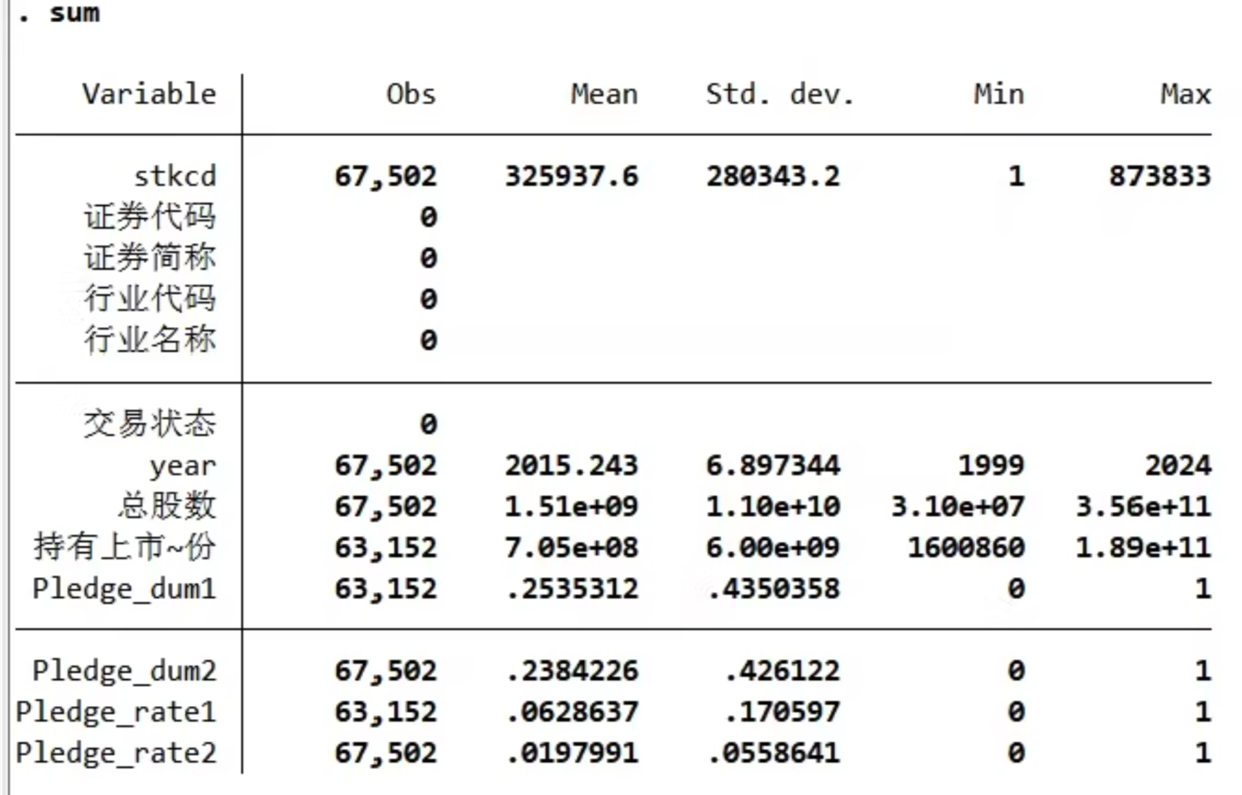 Pledge dum2:年末第一大股东是否存在股权质押,存在股权质押则为 1,否则为 0因总股本数最早是 1999 年,所以样本期间是 1999-2024 年。