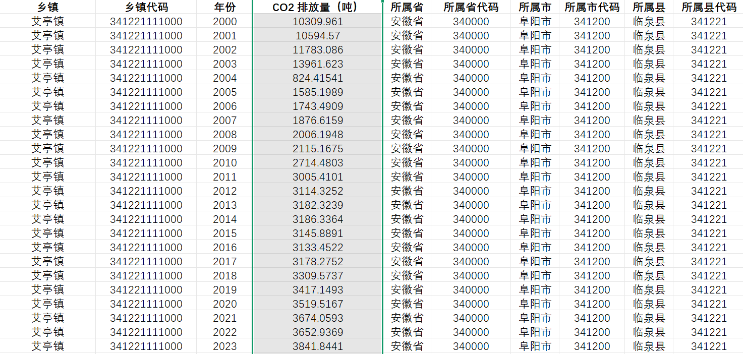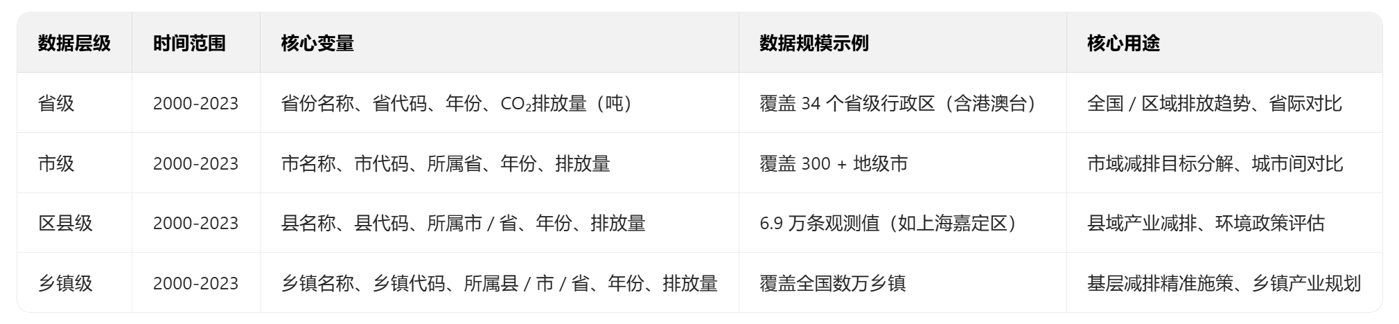 数据最核心的价值在于“全层级覆盖”—— 从省级的宏观排放总量,到乡镇级的微观排放细节,满足不同尺度的分析需求。所有面板数据均包含 2000-2023 年的连续时间序列,变量设计清晰,直接可用。