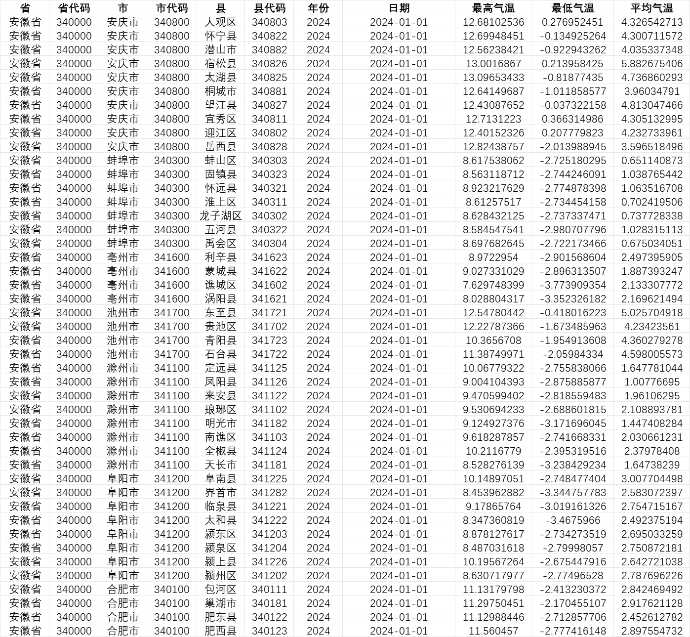 空间层级:从省级、市级到区县级,实现行政区域的 “全层级覆盖”,同时提供 0.1°×0.1° 分辨率的栅格数据(可理解为 “像素级” 气温分布),兼顾宏观区域分析与微观空间研究。