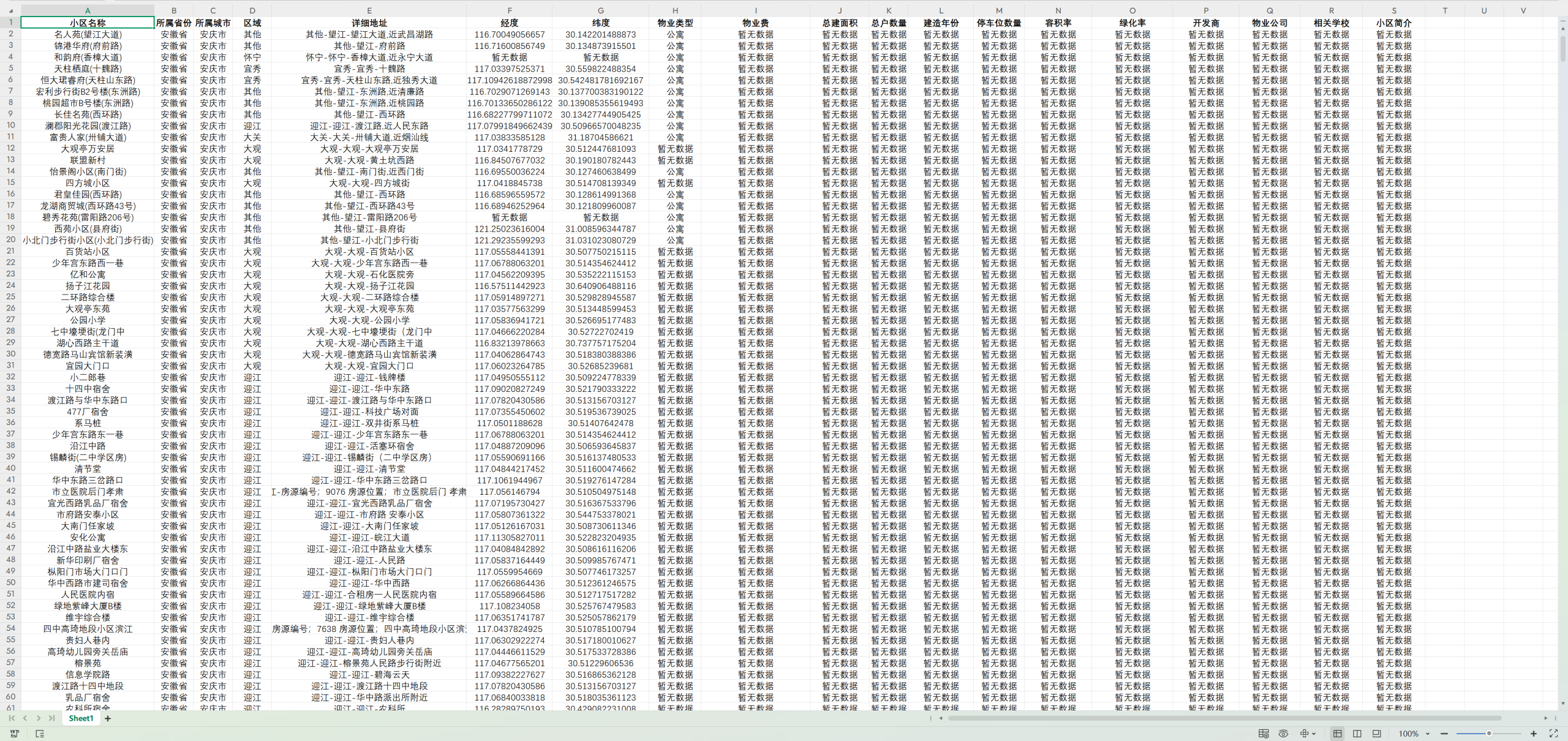指标:小区名称、所属省份、所属城市、区域、详细地址、纬度、经度、物业类型、 物业费、总建面积、总户数量、建造年份 、停车位数量、容积率 、绿化率 、开发商、物业公司。