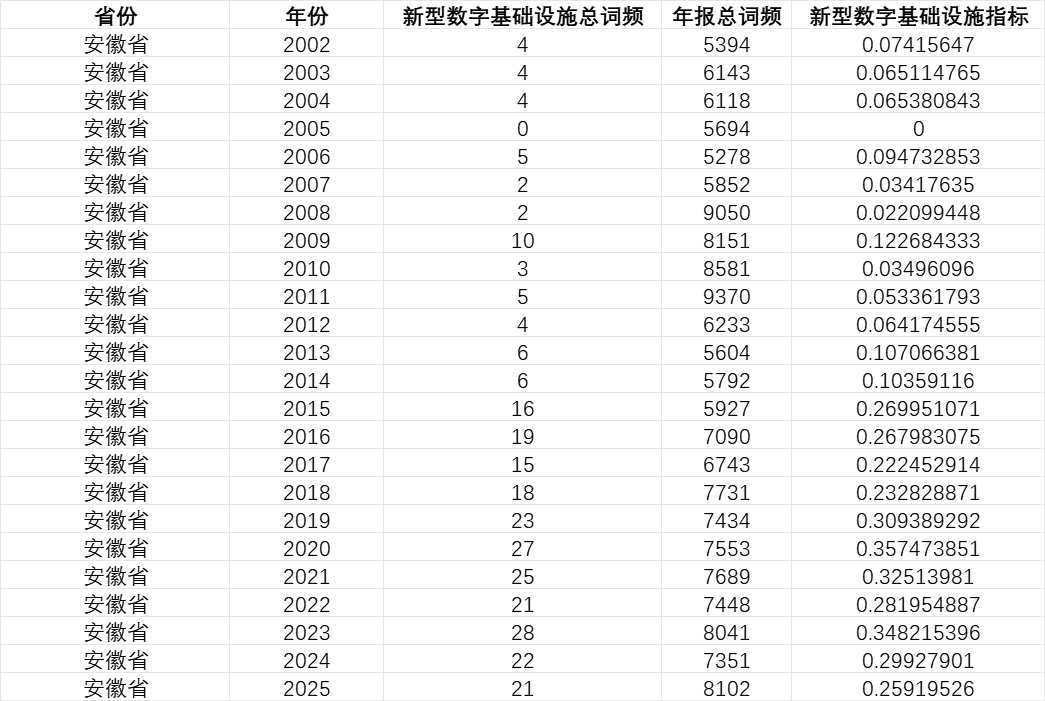 2.量化统计与占比计算:使用 Python 软件对政府工作报告进行分词处理,分别统计报告总词汇量与数字基建相关词汇量,最终通过 “相关词汇占比” 这一指标,量化反映各省份不同年份的数字基础设施重视程度与发展导向。