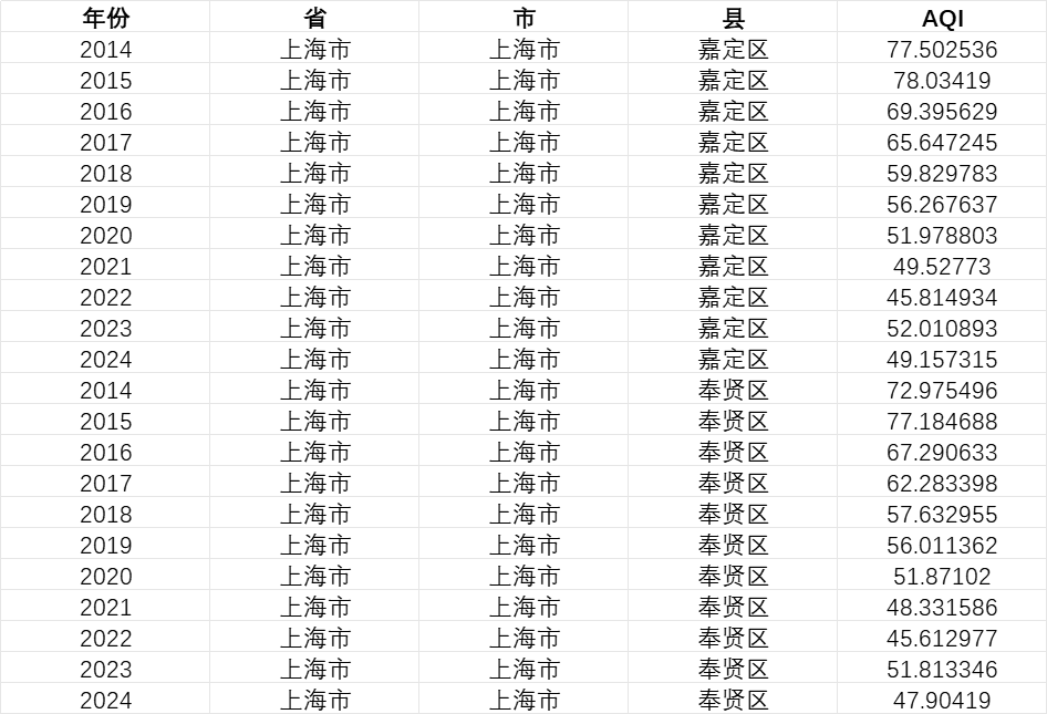 这份2014~2024 年中国各省市区县分年、分月、逐日 AQI 面板数据,涵盖了 10 年跨度、全国范围的空气质量核心信息,不管是做学术研究、政策分析还是日常关注,都能满足需求。数据原始来源是中国环境监测总站全国城市空气质量实时发布平台。
