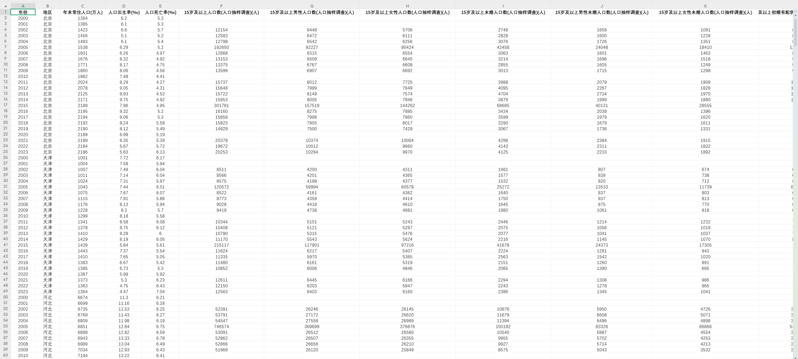 指标:年份、地区、行政区划代码、所属地域、年末常住人口 (万人)、人口出生率 (‰)、人口死亡率 (‰)、15 岁及以上人口数 (人口抽样调查)(人)、15 岁及以上男性人口数 (人口抽样调查)(人)、15 岁及以上女性人口数 (人口抽样调查)(人)、15 岁及以上未婚人口数 (人口抽样调查)(人)、15 岁及以上男性未婚人口数 (人口抽样调查)(人)、15 岁及以上女性未婚人口数 (人口抽样调查)(人)、15 岁及以上初婚有配偶人口数 (人口抽样调查)(人)、15 岁及以上男性初婚有配偶人口数 (人口抽样调查)(人)、15 岁及以上女性初婚有配偶人口数 (人口抽样调查)(人)、15 岁及以上再婚有配偶人口数 (人口抽样调查)(人)、15 岁及以上男性再婚有配偶人口数 (人口抽样调查)(人)、15 岁及以上女性再婚有配偶人口数 (人口抽样调查)(人)、15 岁及以上离婚人口数 (人口抽样调查)(人)、15 岁及以上男性离婚人口数 (人口抽样调查)(人)、15 岁及以上女性离婚人口数 (人口抽样调查)(人)、15 岁及以上丧偶人口数 (人口抽样调查)(人)、15 岁及以上男性丧偶人口数 (人口抽样调查)(人)、15 岁及以上女性丧偶人口数 (人口抽样调查)(人)、15 岁及以上有配偶人口数 (人口抽样调查)(人)、15 岁及以上男性有配偶人口数 (人口抽样调查)(人)、15 岁及以上女性有配偶人口数 (人口抽样调查)(人)、15 岁及以上人口数 (人口抽样调查)(人)、15 岁及以上男性人口数 (人口抽样调查)(人)、15 岁及以上女性人口数 (人口抽样调查)(人)、结婚登记 (万对)、内地居民登记结婚 (万对)、内地居民初婚登记 (万人)、内地居民再婚登记 (万人)、涉外及港澳台居民登记结婚 (万对)、离婚登记 (万对)、粗离婚率 (‰)。