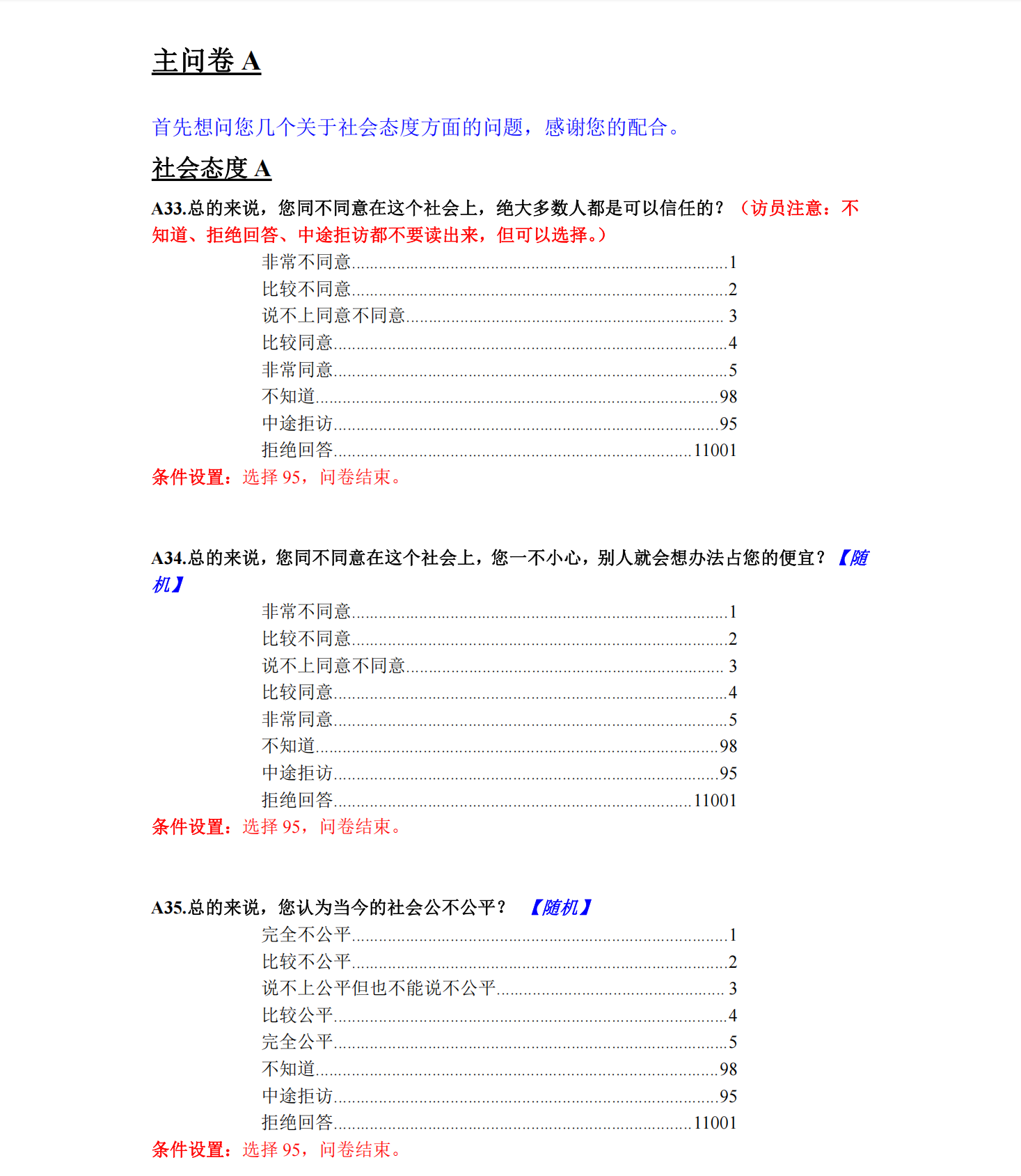 中国综合社会调查(Chinese General Social Survey,CGSS)始于2003年,是我国最早的全国性、综合性、连续性学术调查项目。CGSS系统、全面的收集社会、社区、家庭、个人多个层次的数据,总结社会变迁的趋势,探讨具有重大科学和现实意义的议题,推动国内科学研究的开放与共享,为国际比较研究提供数据资料,充当多学科的经济与社会数据采集平台。
