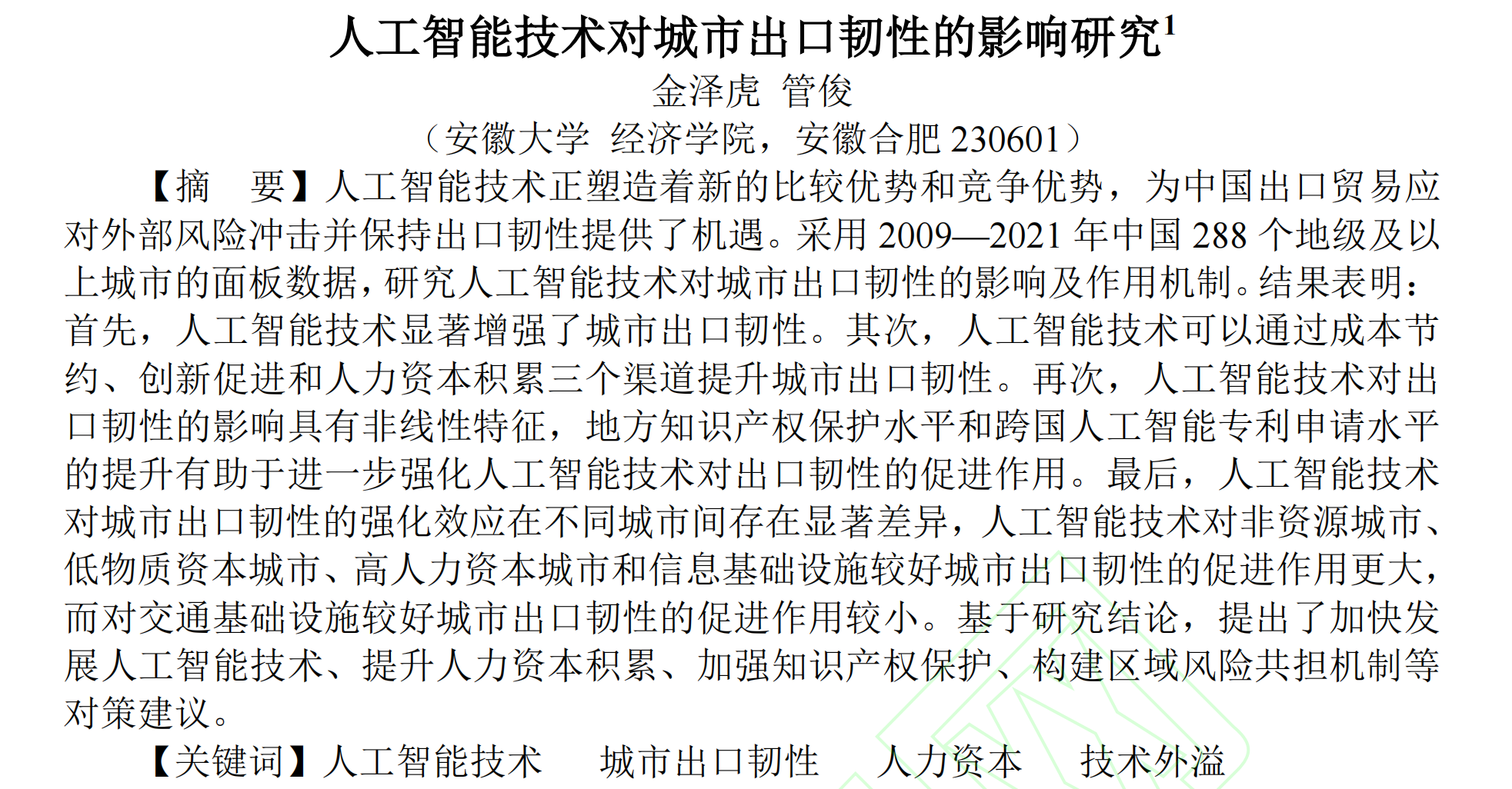参考文献:[1]金泽虎,管俊.人工智能技术对城市出口韧性的影响研究[J/OL].价格月刊,1-15[2024-06-19].