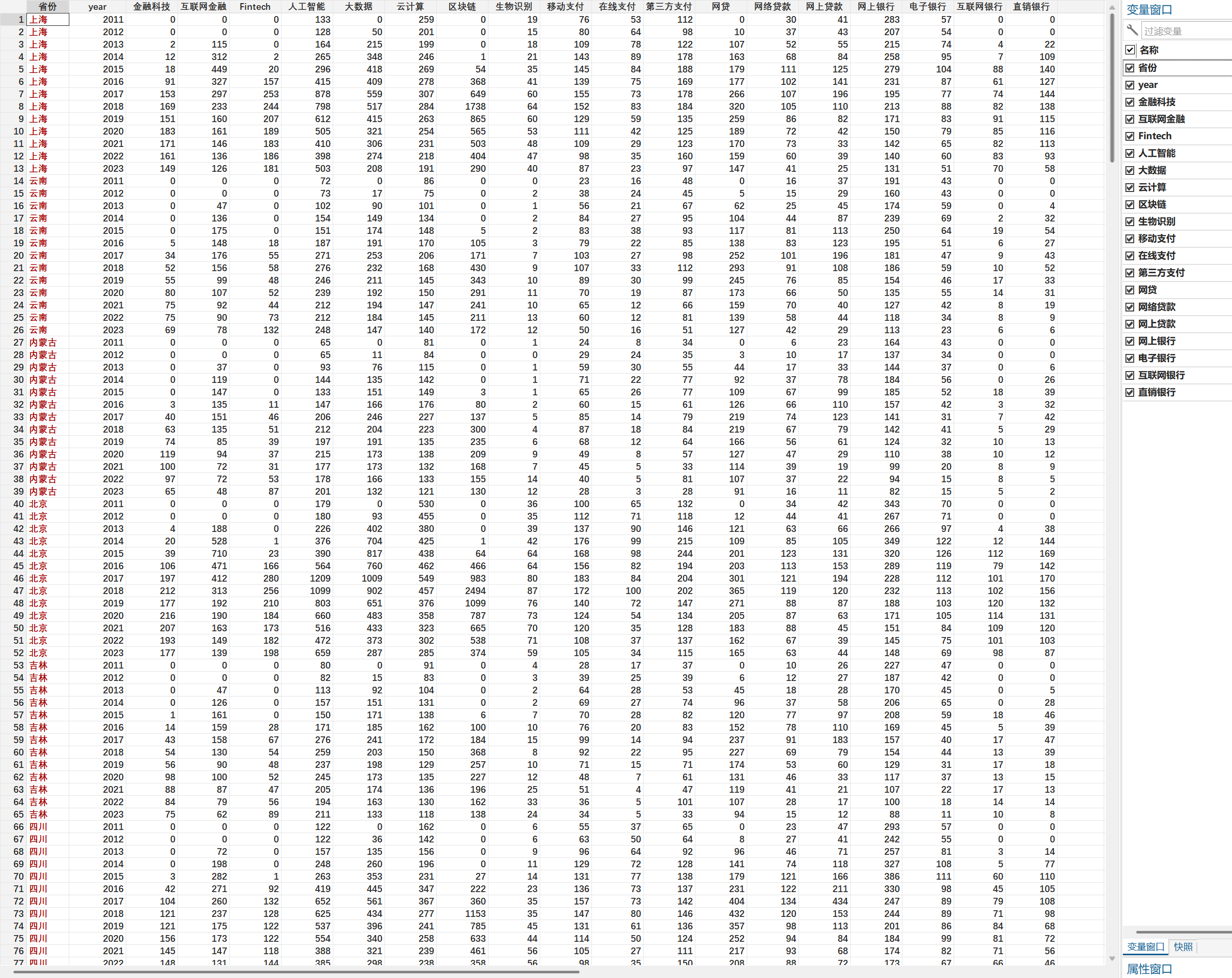 包括如下指标:省份、year、金融科技、互联网金融、Fintech、人工智能、大数据、云计算、区块链、生物识别、移动支付、在线支付、第三方支付、网贷、网络贷款、网上贷款、网上银行、电子银行、互联网银行、直银行、金科_1、金科_2、金科_3、金科_4、金科_5、金科_6、金科_7、金科_8 。