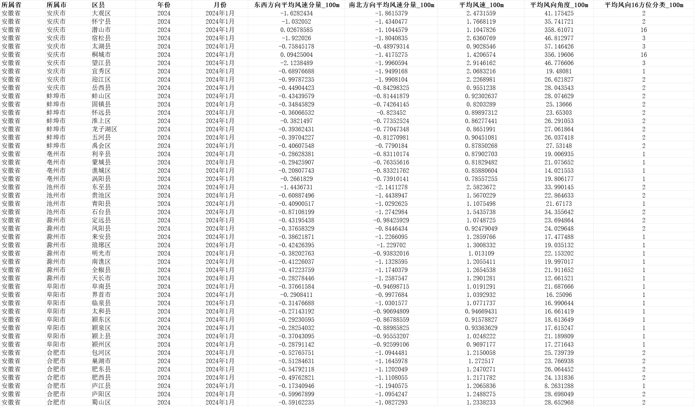 平均风向 16 方位分类_100m:将 360° 风向角划分为 16 个标准方位(如北风、东北偏北、东北风等),便于直观理解风向分布特征。