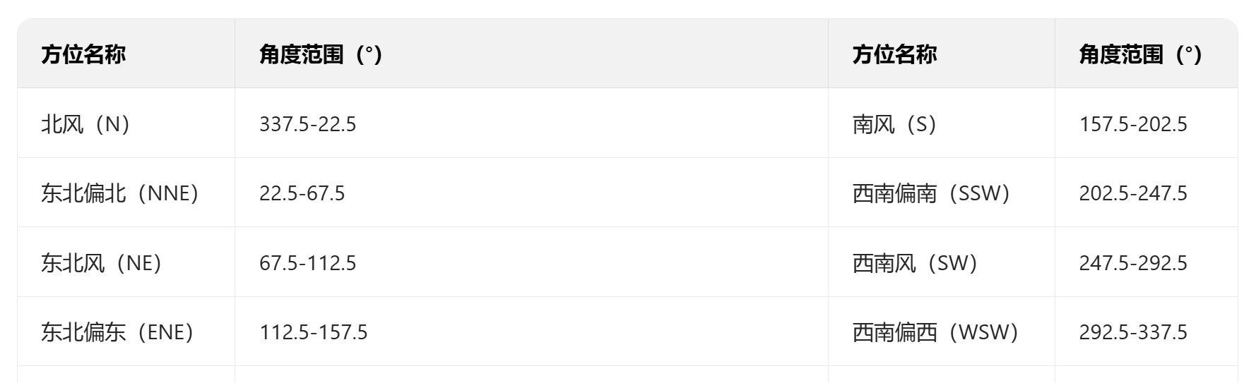 为进一步简化分析,数据集将 360° 风向角对应为 16 个标准方位,具体划分规则如下(角度范围为 “左闭右开”):