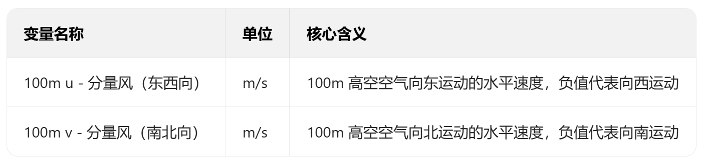 数据处理的核心依据是 ERA5 中的两个关键风场变量,二者共同构成了风速与风向计算的基础: