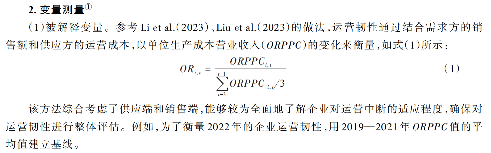 参考 Li et al(. 2023)、Liu et al(. 2023)的做法,运营韧性通过结合需求方的销售额和供应方的运营成本,以单位生产成本营业收入(ORPPC)的变化来衡量,该方法综合考虑了供应端和销售端,能够较为全面地了解企业对运营中断的适应程度,确保对运营韧性进行整体评估。例如,为了衡量 2022 年的企业运营韧性,用 2019—2021 年 ORPPC 值的平均值建立基线。