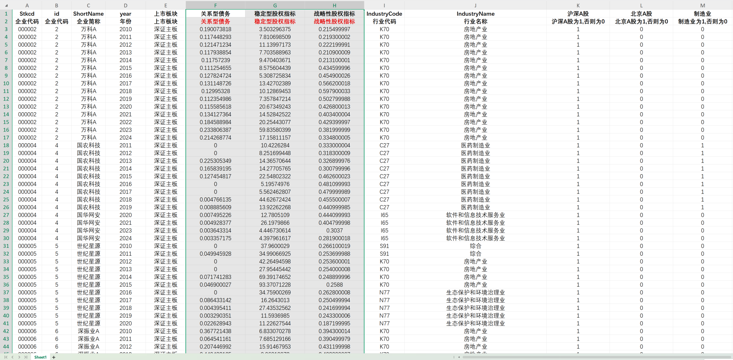 方法:参考《中国工业经济》《河海大学学报》姜中裕等研究方法计算。 核心指标: 关系型债务:企业长期负债(长期借款、应付债券、长期应付款等)与总负债的比。 稳定型股权指标:机构投资者持股比例除以该比例在过去3年的标准差,由于部分观测值的标准差为0而无法计算。 战略型股权指标:若某一机构投资者对该企业的持股时长超过其对全部企业的持股时长的平均值,那么该机构投资者对于该企业属于战略性投资者。对该企业当年全部战略性投资者的持股比例进行加总,即战略性股权指标。