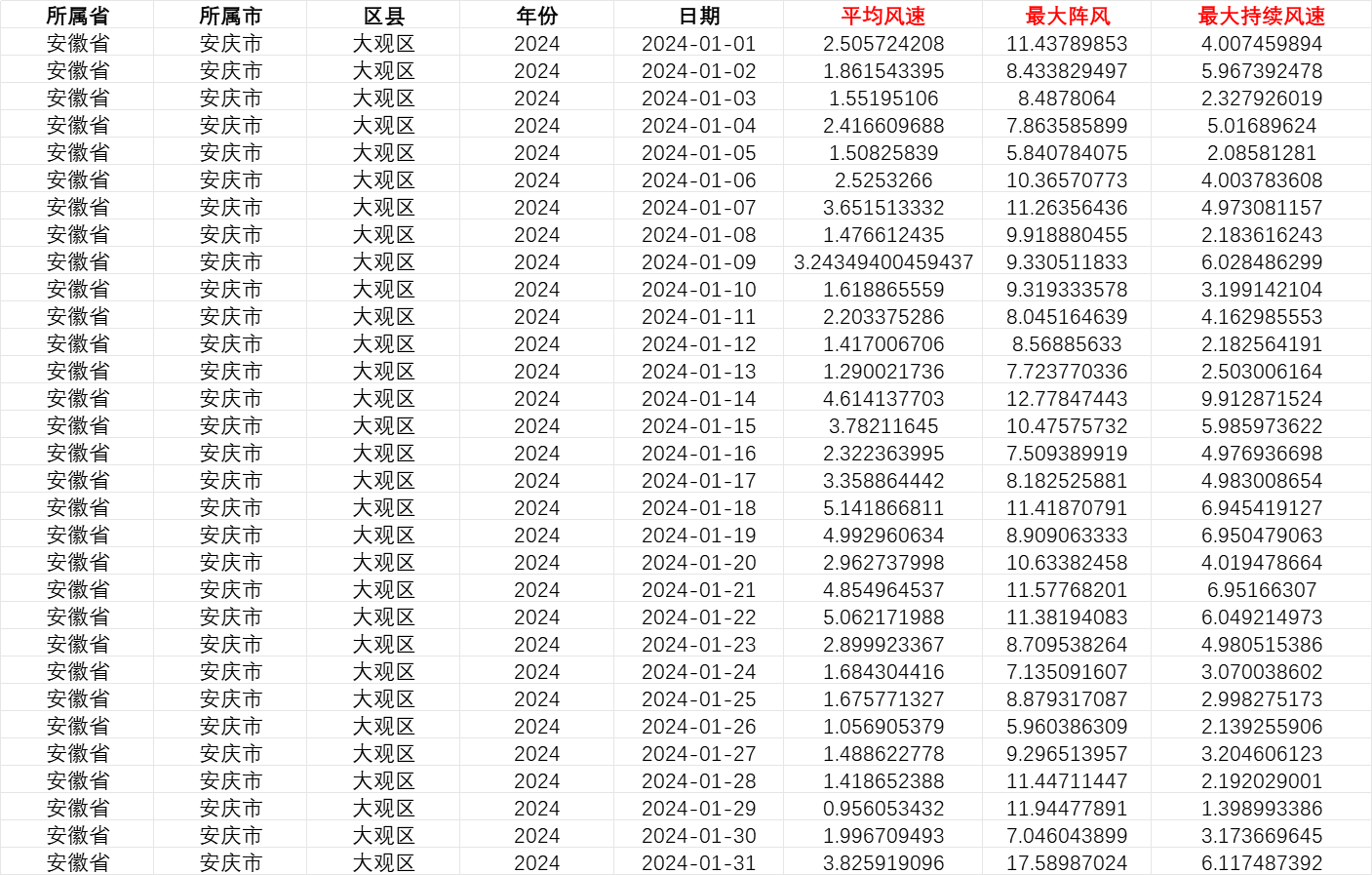 日度最大阵风:记录每日瞬时最大风速,对灾害预警至关重要;