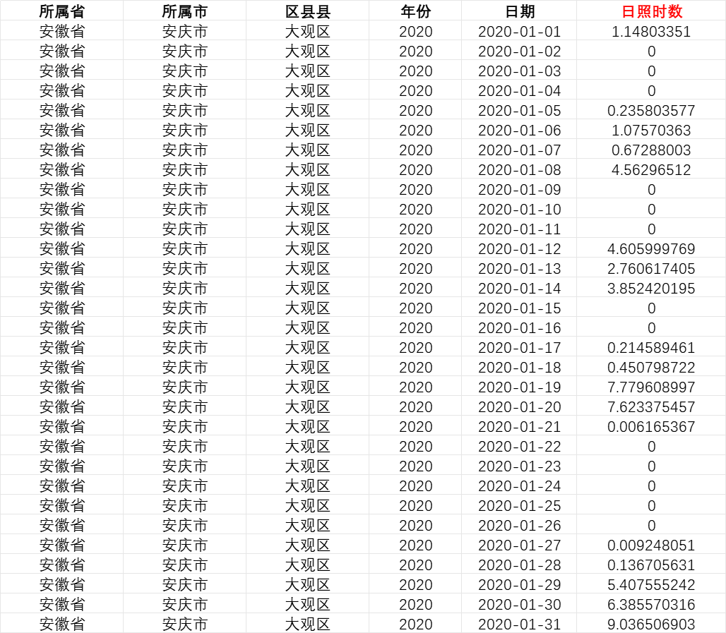 (4)区域汇总:生成分级数据:将栅格数据与 2020 年行政区划图层匹配,按 “区县 – 城市 – 省份” 三级行政单位分别汇总,最终得到各行政单位的日度、月度、年度日照时数数据。