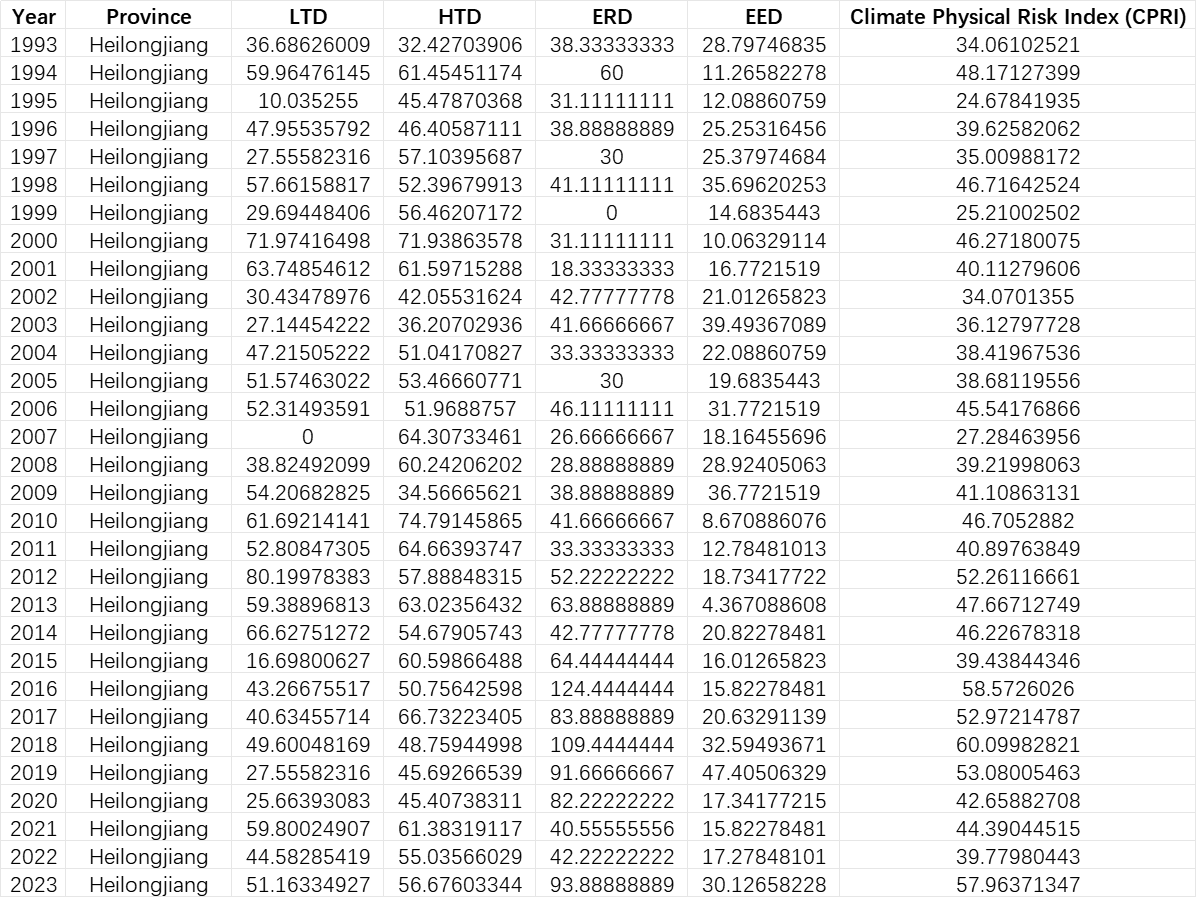 具体指标为Year、Province、City、LTD、HTD、ERD、EED、Climate Physical Risk Index (CPRI)