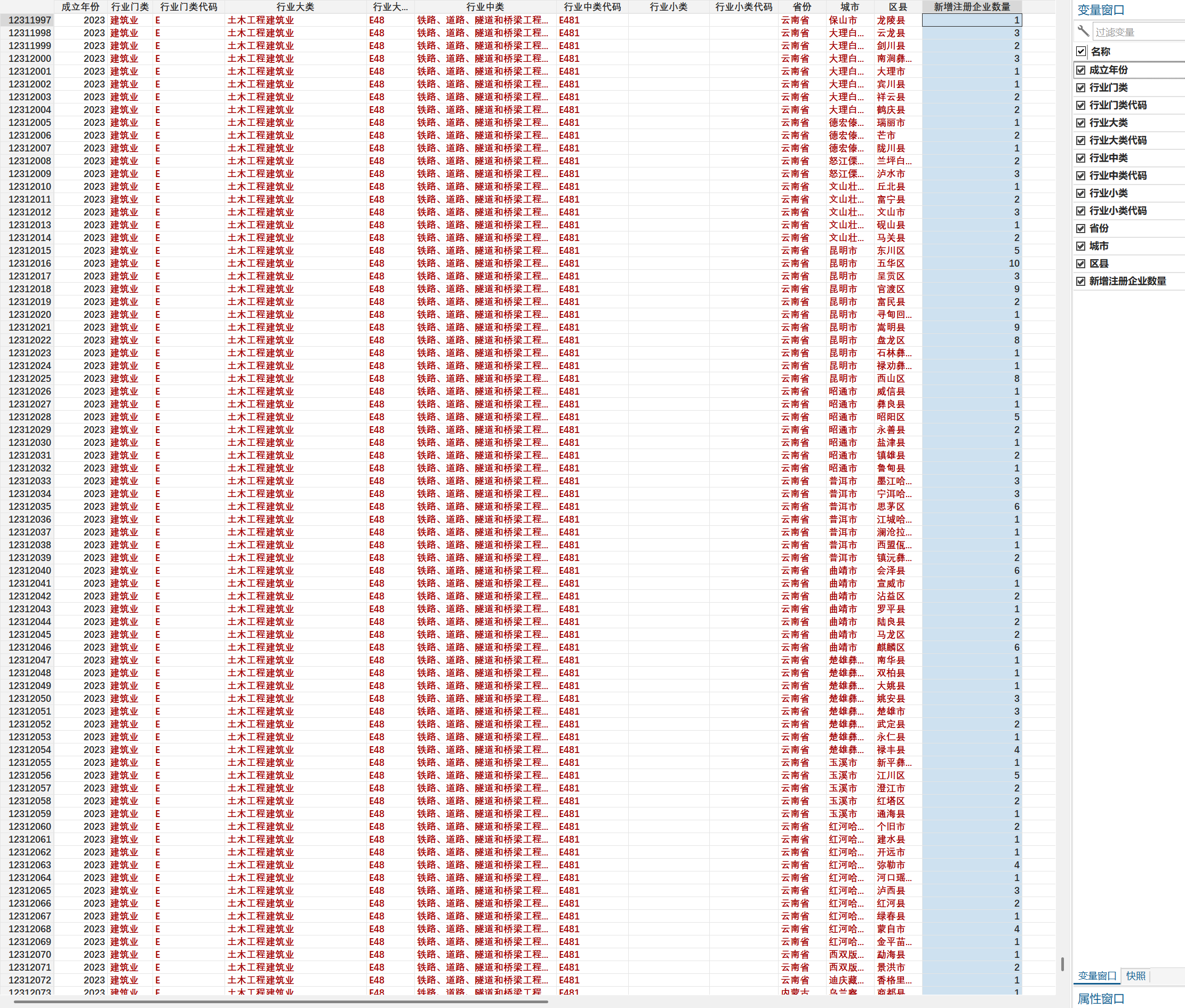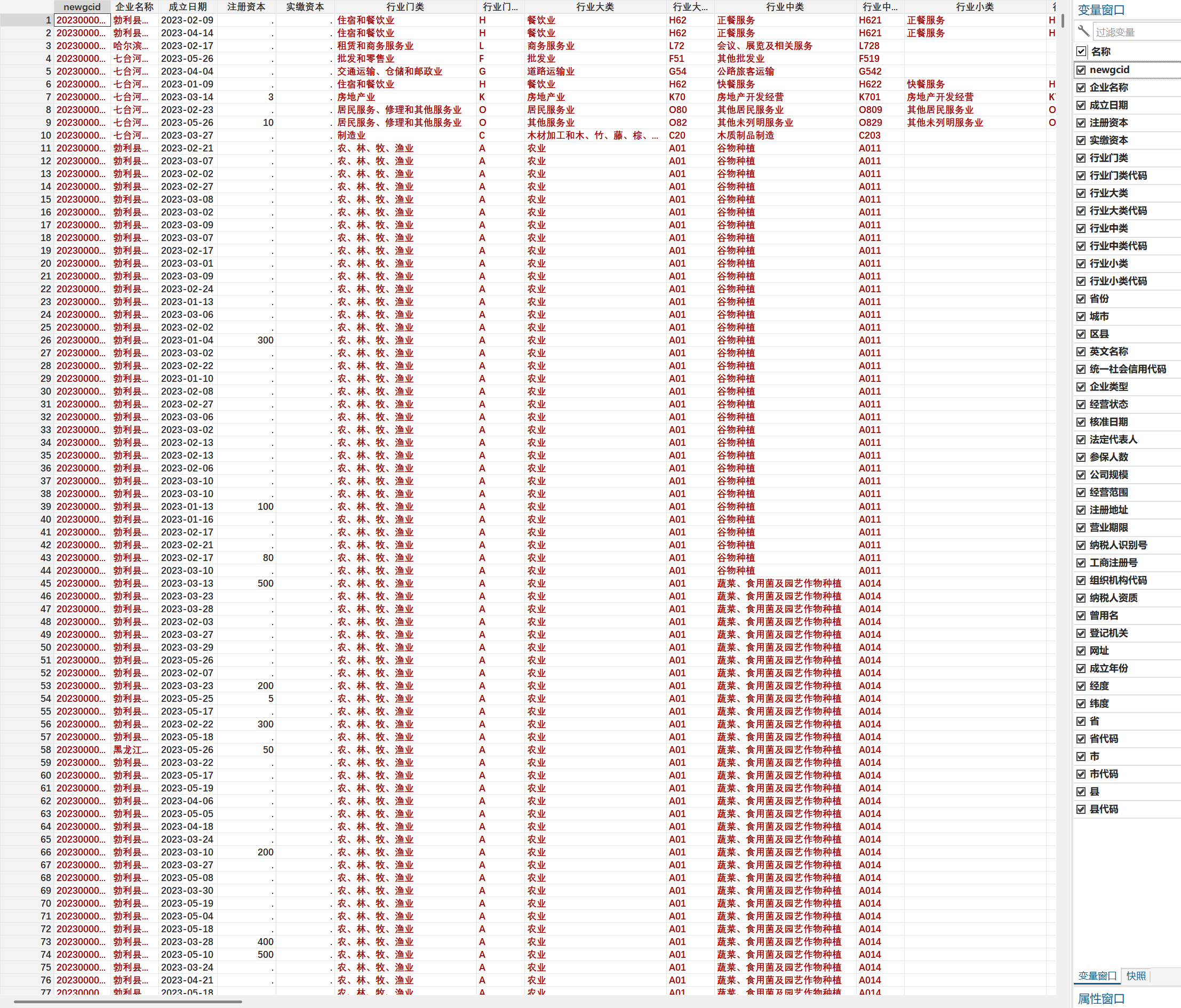 数据指标:企业名称、成立日期、注册资本、实缴资本、行业门类、行业门类代码、行业大类、行业大类代码、行业中类、行业中类代码、行业小类、行业小类代码、省份、城市、区县、法人代表、经营状态、统一社会信用代码、工商注册号、纳税人识别号、组织机构代码、企业类型、登记机关、营业期限、纳税人资质、人员规模、参保人数、曾用名、英文名、注册地址、经营范围、邮箱、标签、成立年份、经度、纬度、省、省代码、市、市代码、县、县代码、核准日期、英文名称、法定代表人、公司规模、网址。
