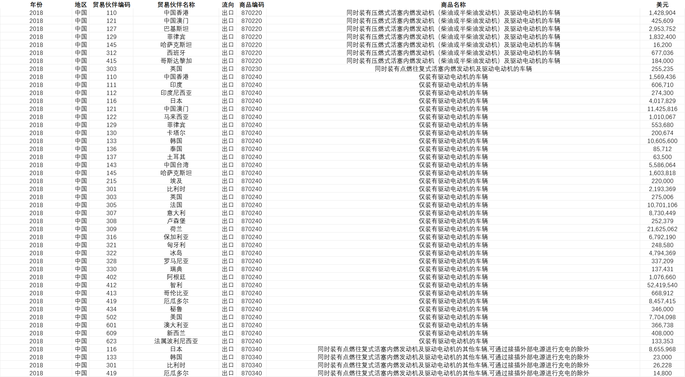 数据名称:中国与世界各国新能源汽车进出口数据