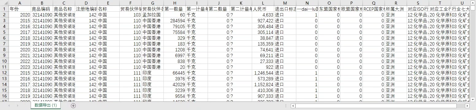 主要变量: 年份、商品编码、商品名称、注册地编码、注册地名称、贸易伙伴编码、贸易伙伴名称、第一数量、第一计量单位、第二数量、第二计量单位、人民币、进出口标志、一带一路国家标志、东盟国家标志、欧盟国家标志、RCEP国家标志、所属大洲、对应ISO行业分类、对应工业行业代码名称、行业七大类编码名称。