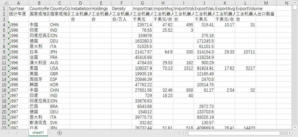 数据来源:基于上市公司年报、公告数据及相关省市数据整理 数据范围:沪深北证 上市公司 A股,含主板、中小企业板、创业板、科创板、北京证券交易所的服务板块,5000多只个股的数据。 数据指标:统计年度、国家或地区名称、国家或地区代码、工业机器人安装量、工业机器人保有量、工业机器人密度、工业机器人进口金额、工业机器人进口均价、工业机器人进口数量、工业机器人出口金额、工业机器人出口均价、工业机器人出口数量。