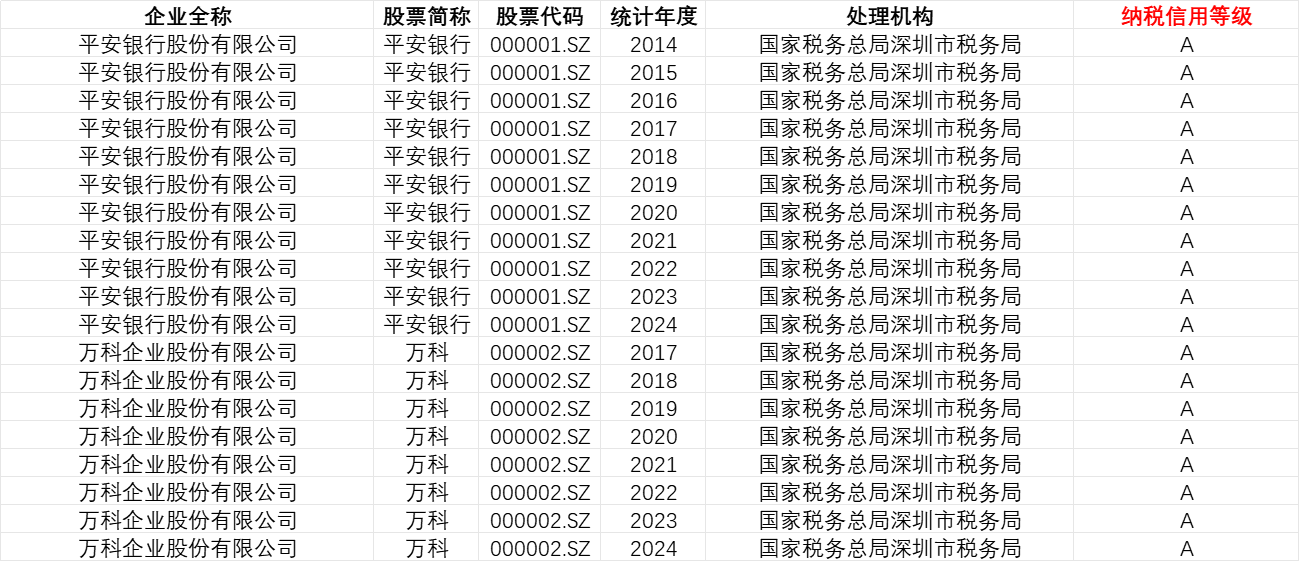 数据范围:所有A股上市公司 时间跨度:2005-2024年 纳税信用等级评价:由税务部门主导开展,每年进行一次。评价围绕主观态度、遵从能力、实际结果、失信程度 4 个核心维度,结合近 100 项具体评价指标,对企业纳税人的信用状况进行综合评定,最终形成由高至低分为 A、B、M、C、D 五级的评价结果。后续税务部门将遵循 “守信激励、失信惩戒” 原则,针对不同信用级别的纳税人实施差异化的分类服务与管理。