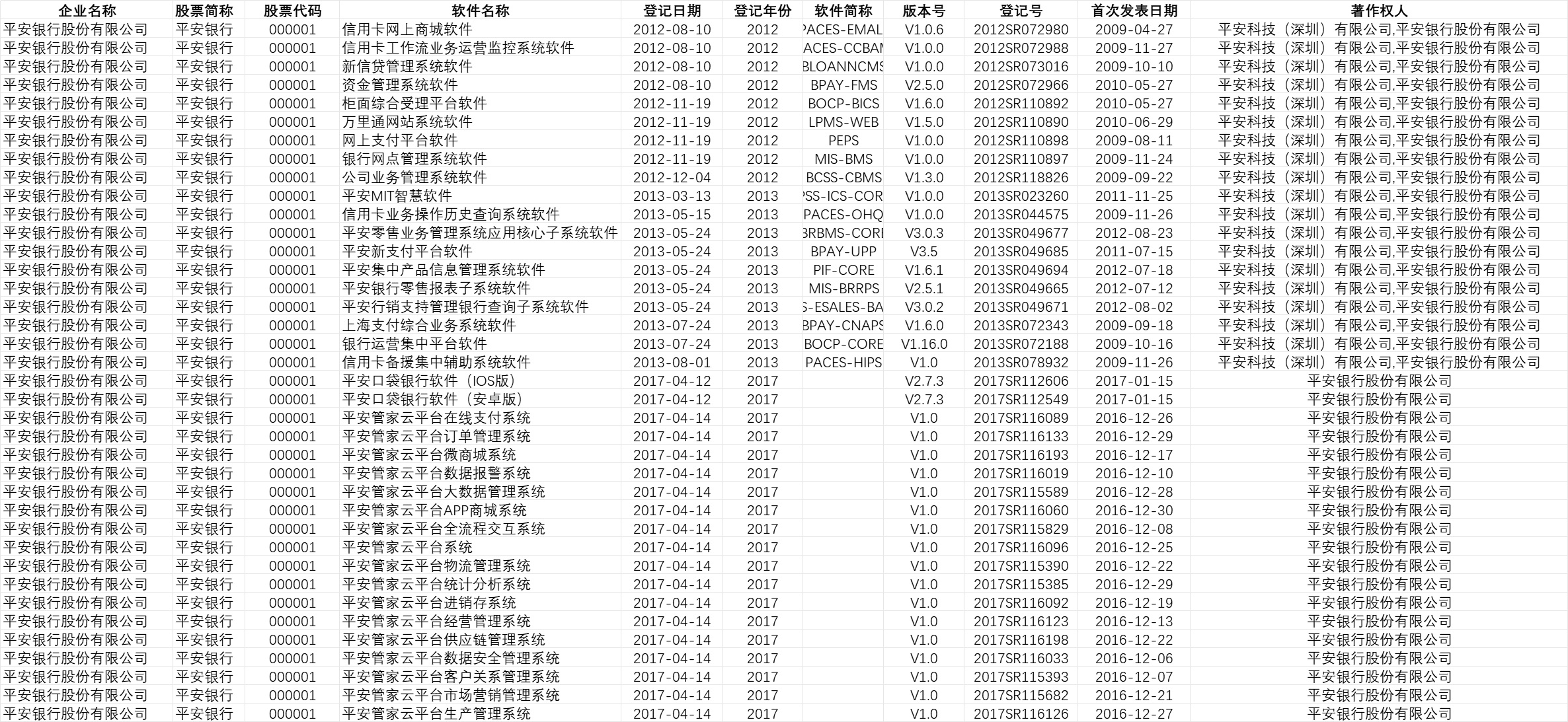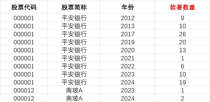 数据指标:企业名称、股票简称、股票代码、软件名称、登记日期、登记年份、软件简称、版本号、登记号、首次发表日期、著作权人、软著数量。