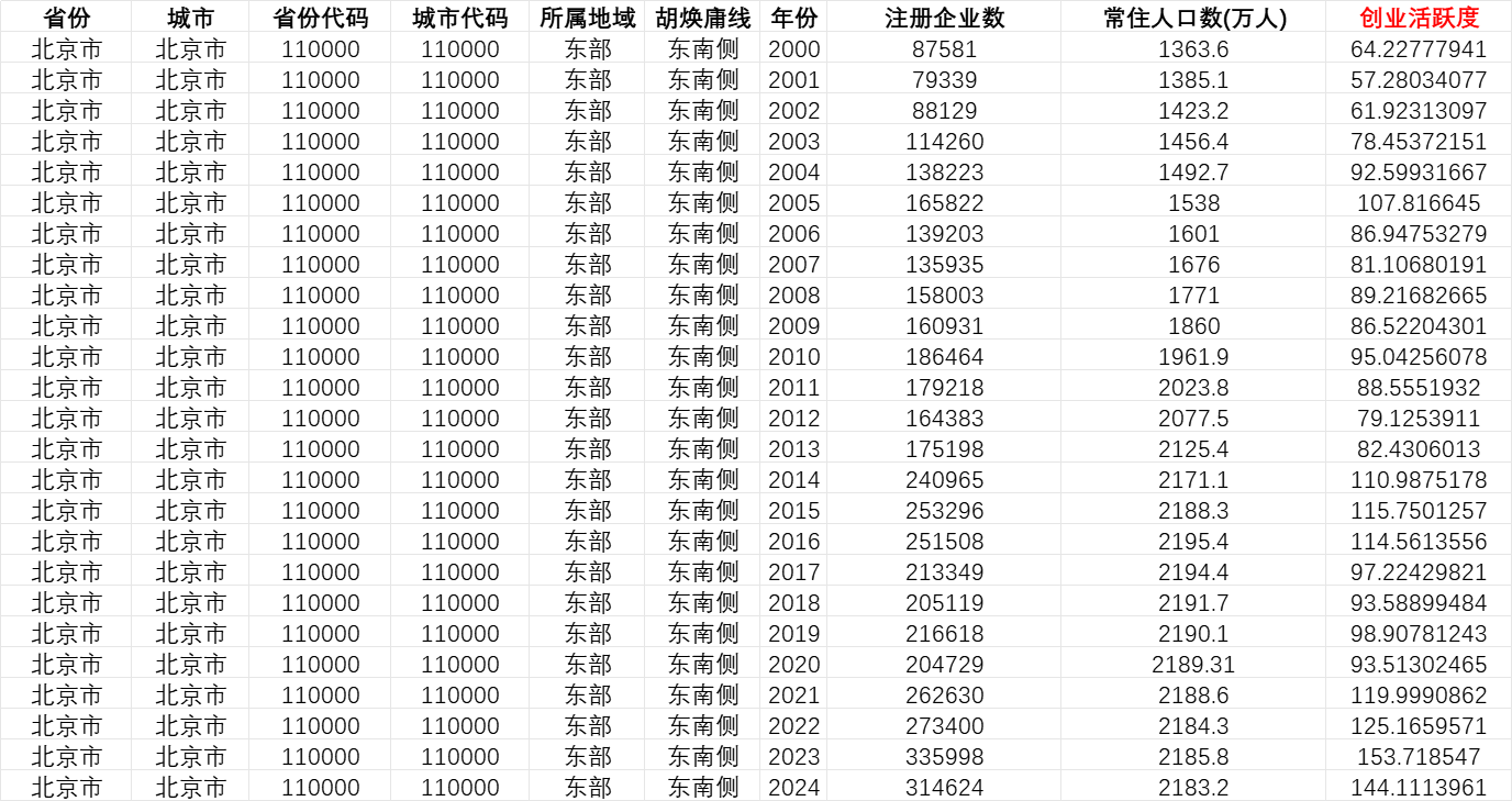 具体公式为: 创业活跃水平 = 新注册企业数量 / 常住人口总数