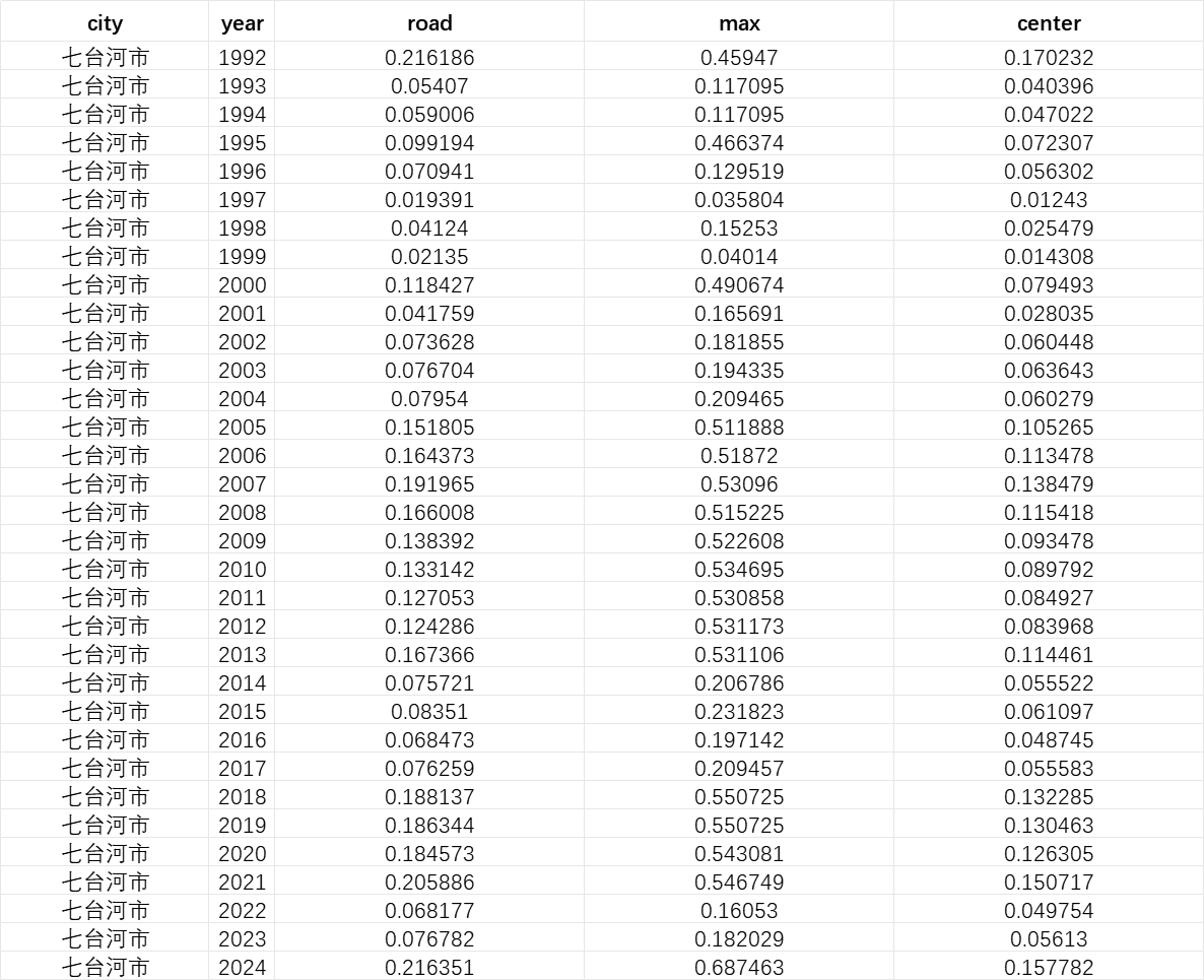 城市形态指标包含 road、max、center 三类。其中,road 指标的计算方式为:先求取一个城市内所有栅格间地表直线距离的平均值,再将该平均值除以城市面积 area 的平方根。当城市包含 R 个栅格时,会产生 [R×(R-1)]/2 个栅格间距离,对这些距离取均值后再除以面积平方根,便能得到 road 指标,该指标可反映城市内部各地点间的平均相互距离;max 指标是城市内所有栅格间距中的最大值除以 area 的平方根,它代表了城市内部可能存在的最远距离;center 指标则是城市内每个栅格到城市中心点的地表直线距离的平均值除以 area 的平方根,其作用是反映城市中心的通达性 ——center 值越大,意味着大多数居民到市中心的距离越远。