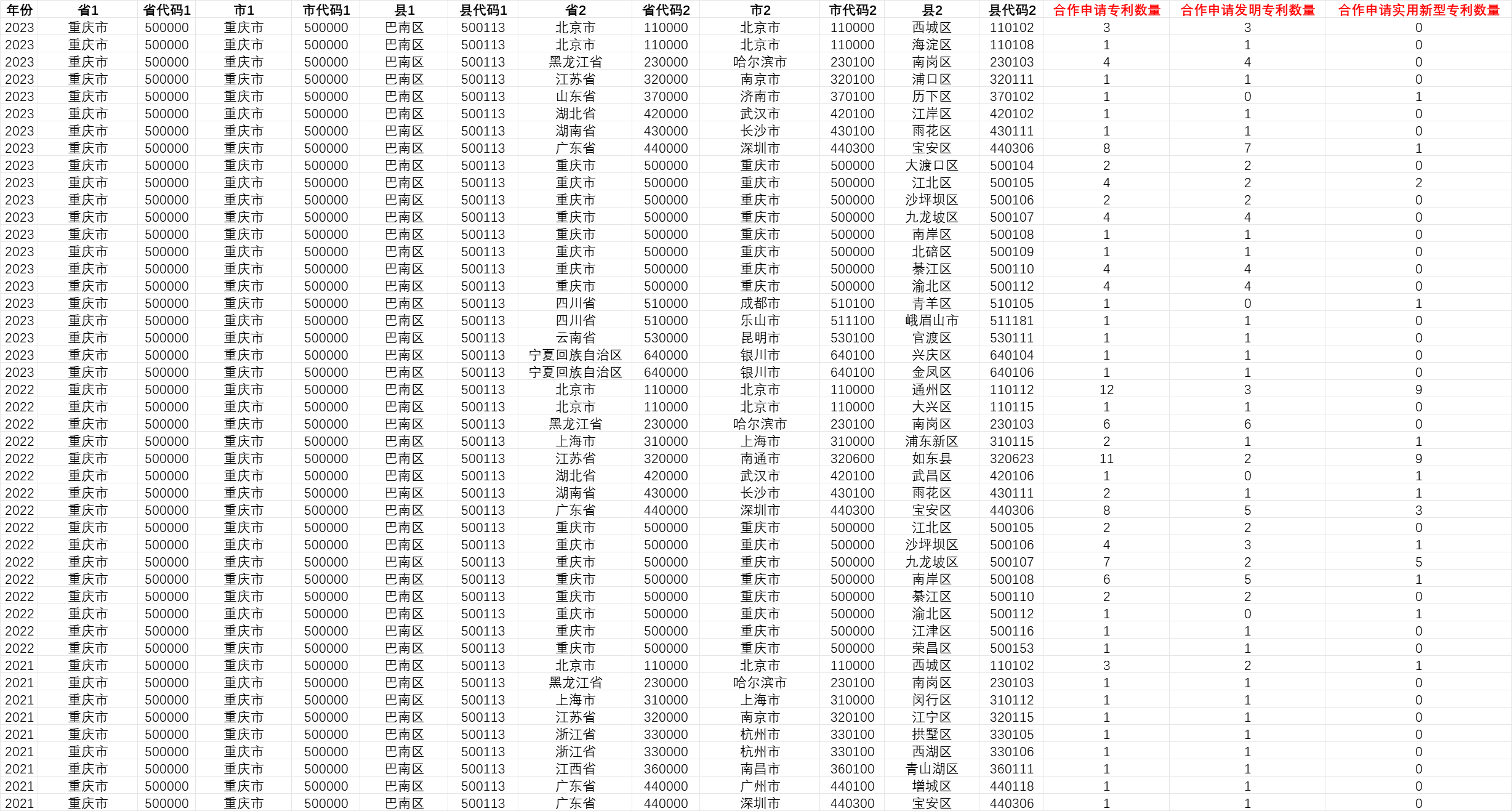 处理技术:通过地理编码技术解析全国所有绿色专利申请企业的经纬度信息,再按行政层级(省份、城市、区县)匹配 “区域对”(如 “北京市 – 南京市”“北京市海淀区 – 上海市浦东新区”),最终统计出不同区域间的合作申请数量,确保数据的空间关联性与准确性。