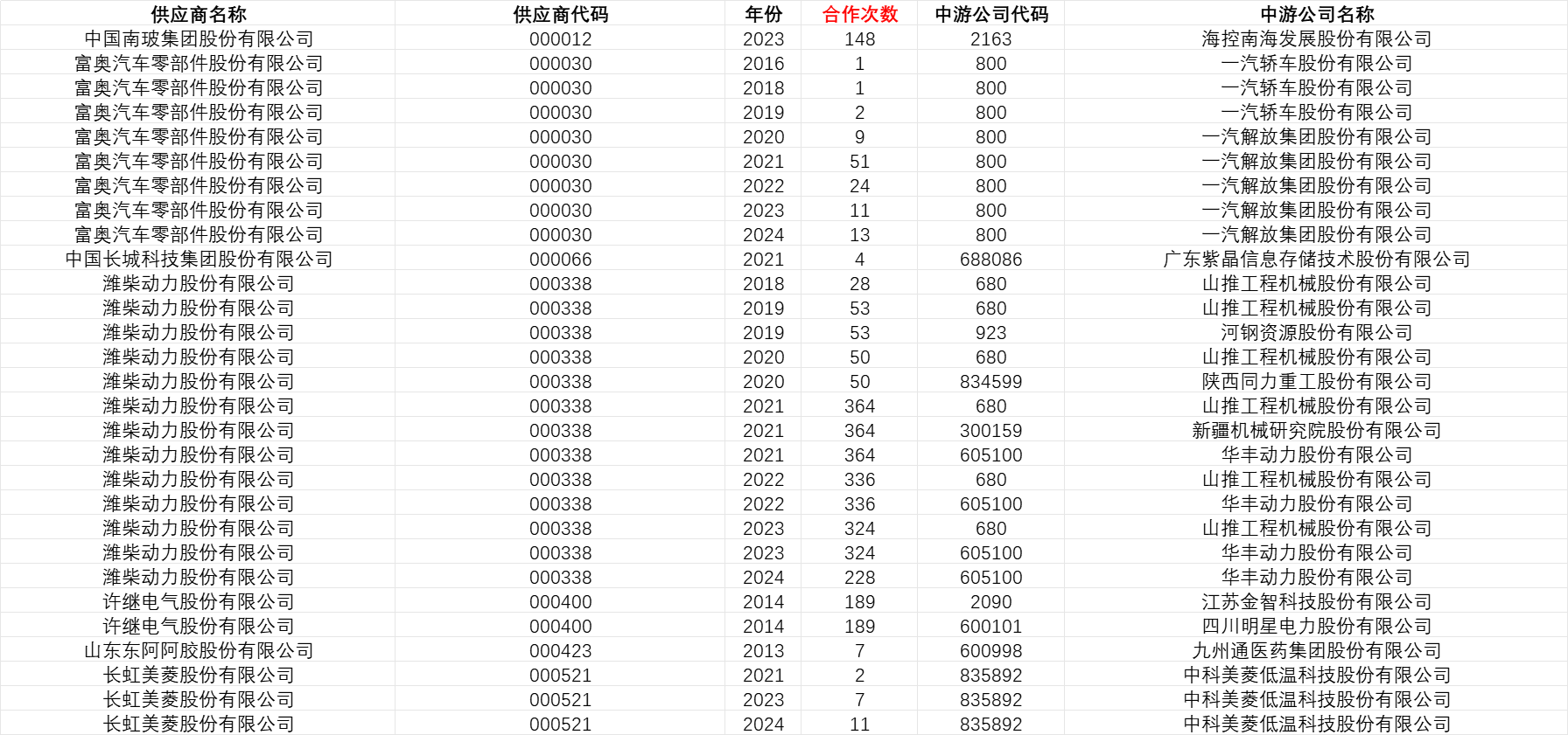 供应商数据处理:逻辑与客户数据一致,侧重应对供应商网络动态变化频繁的挑战。遵循 “数据完整优先、扩充逻辑清晰” 原则,先保留原始合作记录,再按供应商首次出现年份将活跃期延至 2024 年,缺失年份(因无联合专利)补 “合作次数 0”,为供应链网络演化分析提供可靠数据。