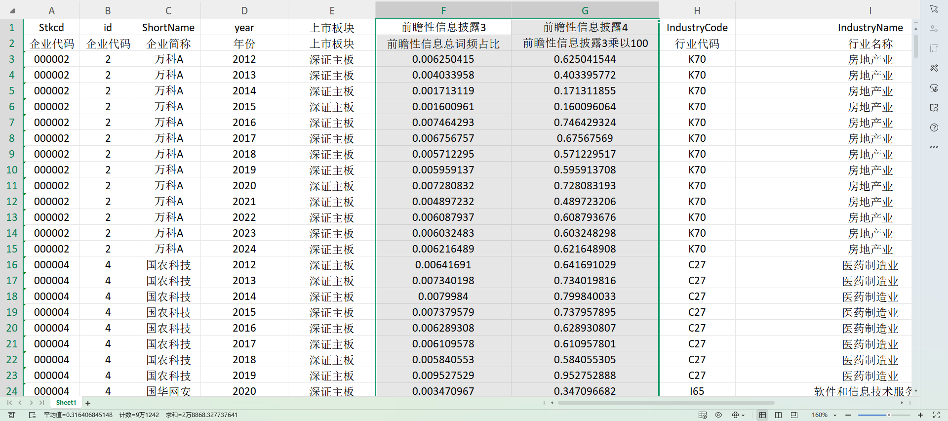 数据范围:全部A股上市公司 样本数量: 45,619 条 参考《会计研究》等期刊,计算前瞻性关键词汇在MD&A 中出现的频次, 除以MD&A全文的总词数, 最终得到前瞻性信息披露变量(已剔除数据缺失、金融业、STPT的观测值,已缩尾)。 指标如下: 前瞻性信息披露1:前瞻性词频占比 前瞻性信息披露2:前瞻性词频占比乘以100