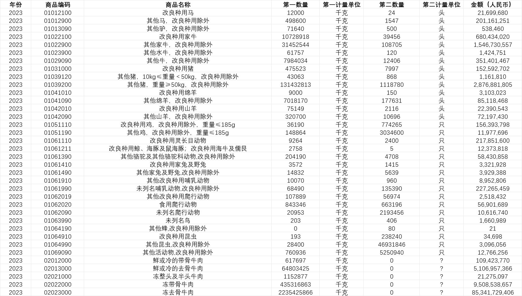 年份、商品编码、商品名称、第一数量、第一计量单位、第二数量、第二计量单位、额(人民币)。