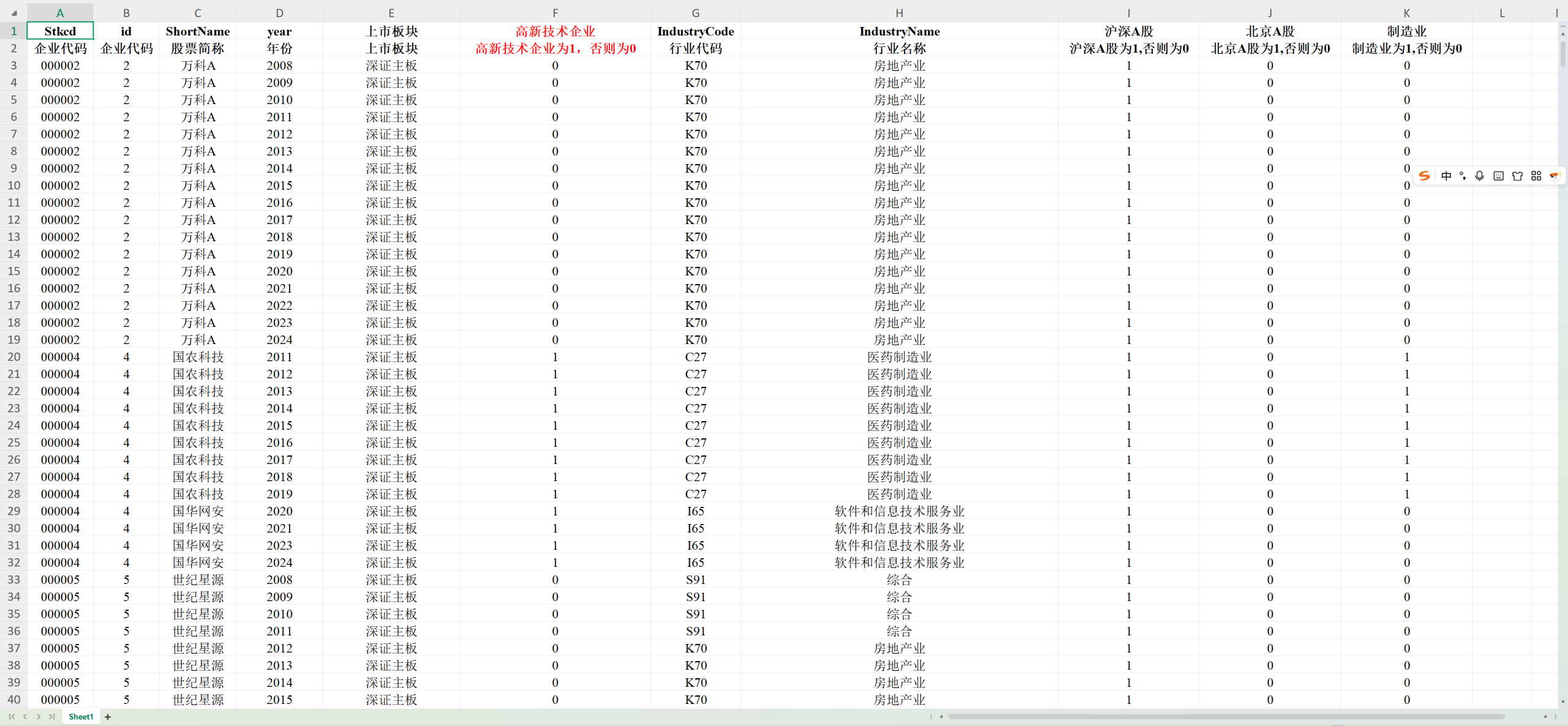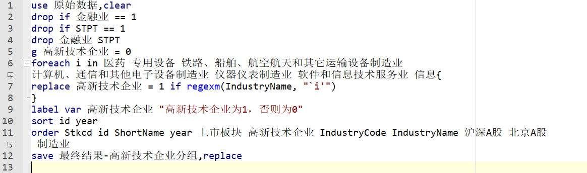 样本数量:53151 条 数据范围:全部A股上市公司 复刻了《会计研究》的方法,鉴于直接识别高新技术企业较为困难,参考相关政府文件将生物药品制造业、铁路船舶航空航天和其他运输设备制造业、计算机、通信和其他电子设备制造业等等定义为高新技术企业。并不是按是否获得高新技术资质来判定的。 核心指标:高新技术企业:高新技术企业为1,否则为0。