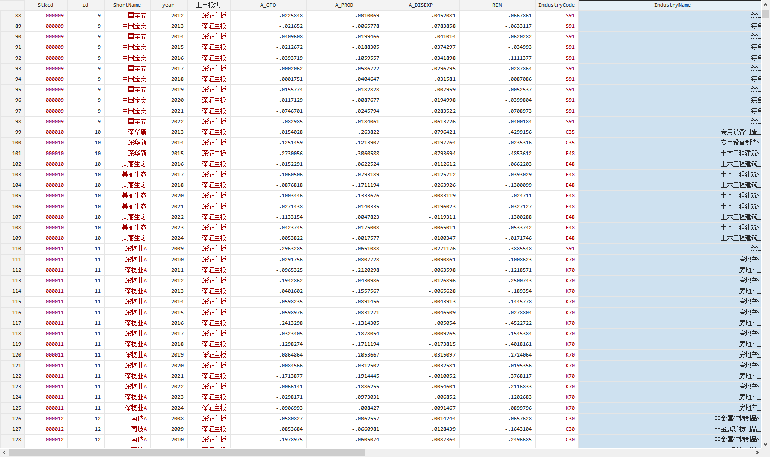 数据范围:所有A股上市公司(2008-2024) 样本数量:44436 条 测算方法:复刻了《会计研究》《南开管理评论》《经济管理》等,借鉴 Dechow (1998) 和 Roychowdhury (2006) 的做法。 核心指标: A_CFO:异常经营活动现金流 A_PROD:异常生产成本 A_DISEXP:异常可操纵性费用 REM:真实盈余管理。等于A_PROD-A_CFO-A_DISEXP。值越大,企业真实盈余管理程度越高