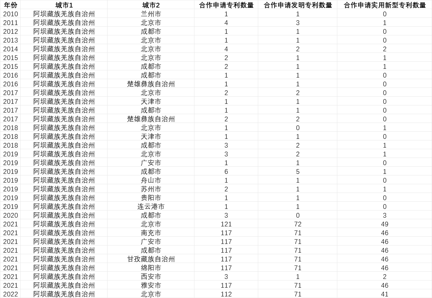 分类统计数量:按 “年份 + 合作对” 维度,分别统计三类数据 ——①合作申请专利总数(该合作对当年共同申请的绿色专利总量);②合作申请发明专利数(总量中属于发明专利的部分);③合作申请实用新型专利数(总量中属于实用新型专利的部分)。未明确列出的合作对,默认当年合作数量为 0。