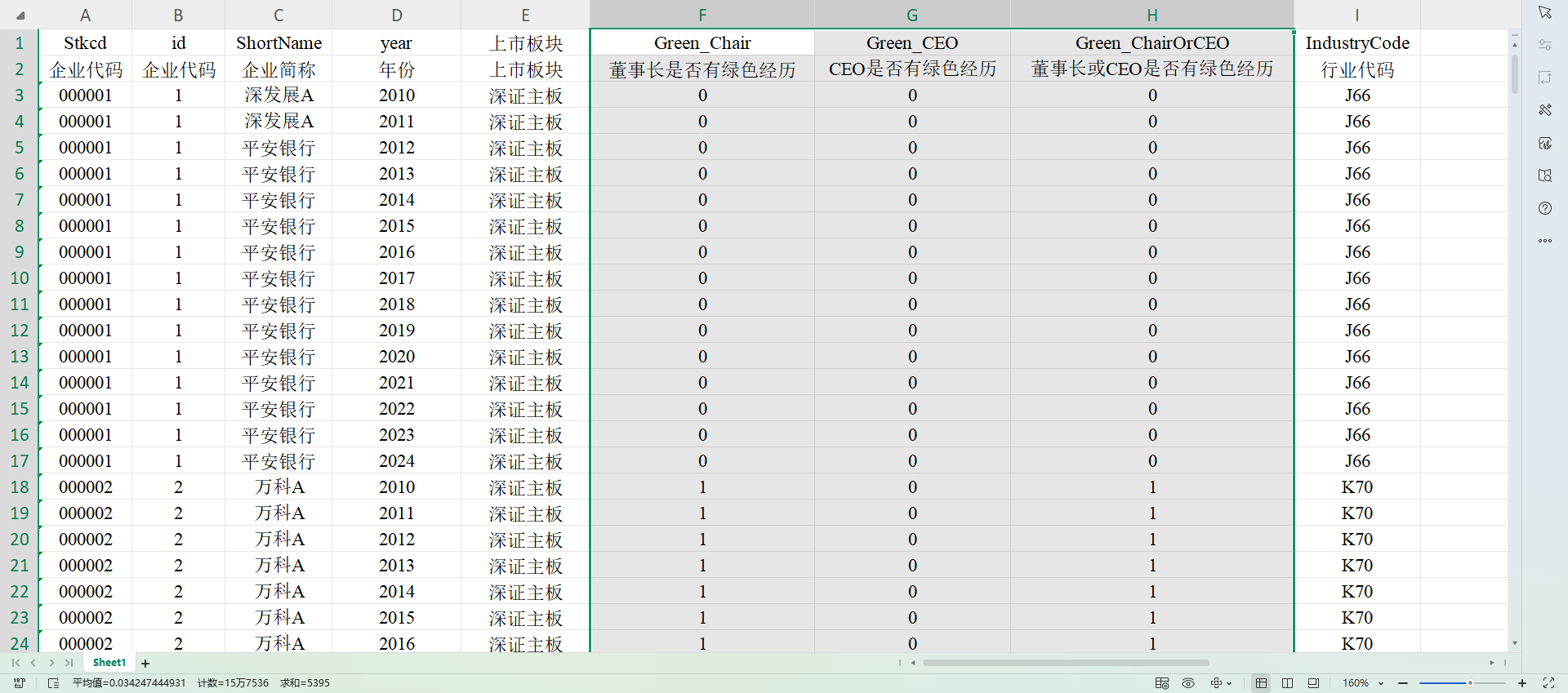 所有A股上市公司,共 52510 条观测值 测算方法:复刻《中国工业经济》《经济管理*2》《经济学报》,以是否接受过绿色相关教育或从事过绿色相关工作来判断是否具有绿色经历。按照文献的做法,只考虑CEO或董事长的绿色经历。 数据来源:CSMAR 指标如下: Green_Chair:董事长是否有绿色经历 Green_CEO:CEO 是否有绿色经历 Green_ChairOrCEO:董事长或 CEO 是否有绿色经历