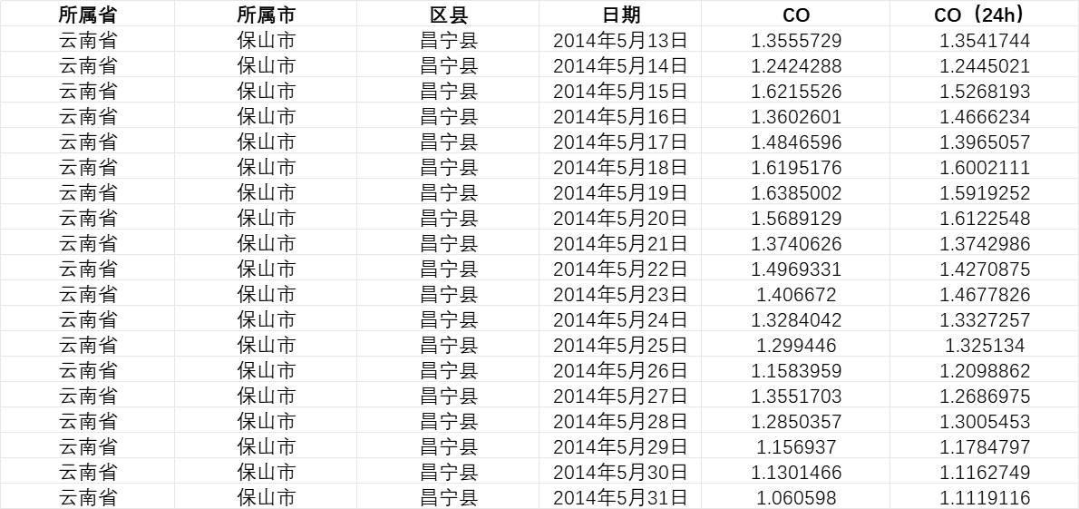 时间跨度:时间维度上,数据集横跨 11 年,完整记录 2014 至 2024 年的 CO 浓度变化。空间维度上,实现中国各省、市、区县的全域覆盖,从省级到区县级的分层数据结构,满足不同尺度的分析需求。