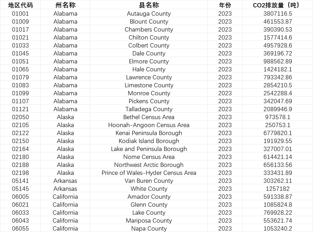 核心变量:地区代码、州名称、县名称、年份、CO2排放量(吨)。