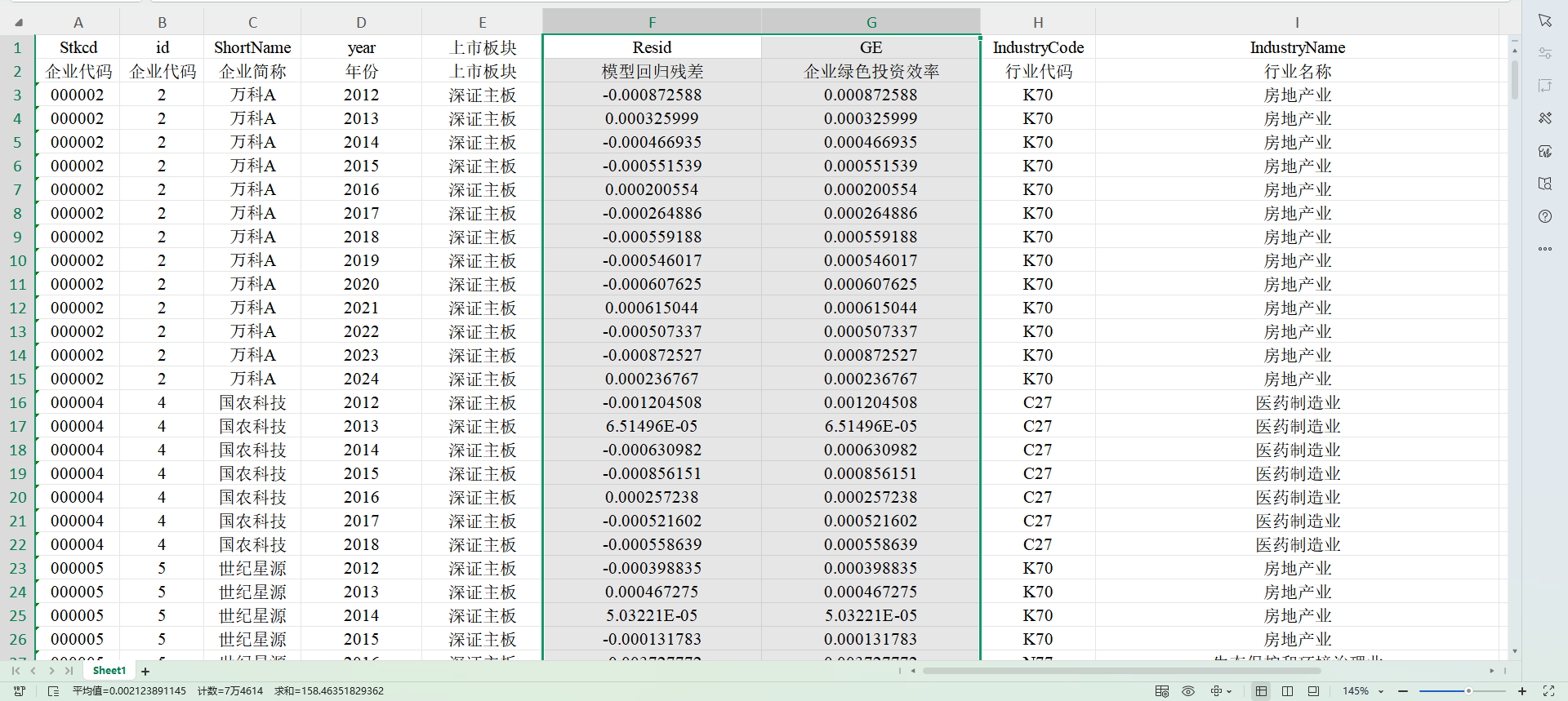 GE:企业绿色投资效率,等于模型回归残差的绝对值,值越小,绿色投资效率越高。