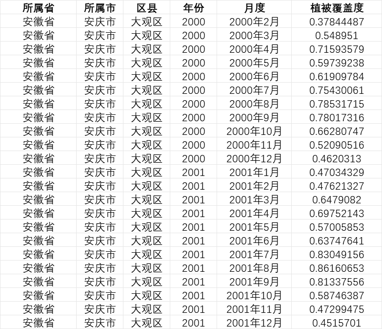 经专业处理后,形成三份便捷使用的标准化文件,分别对应各省份、各城市、各区县的平均植被覆盖度数据,包含省 / 市 / 县名称及代码、年份、月份、植被覆盖度等核心变量,总观测值达 86 万 +,变量设置规范,可直接用于各类分析场景。