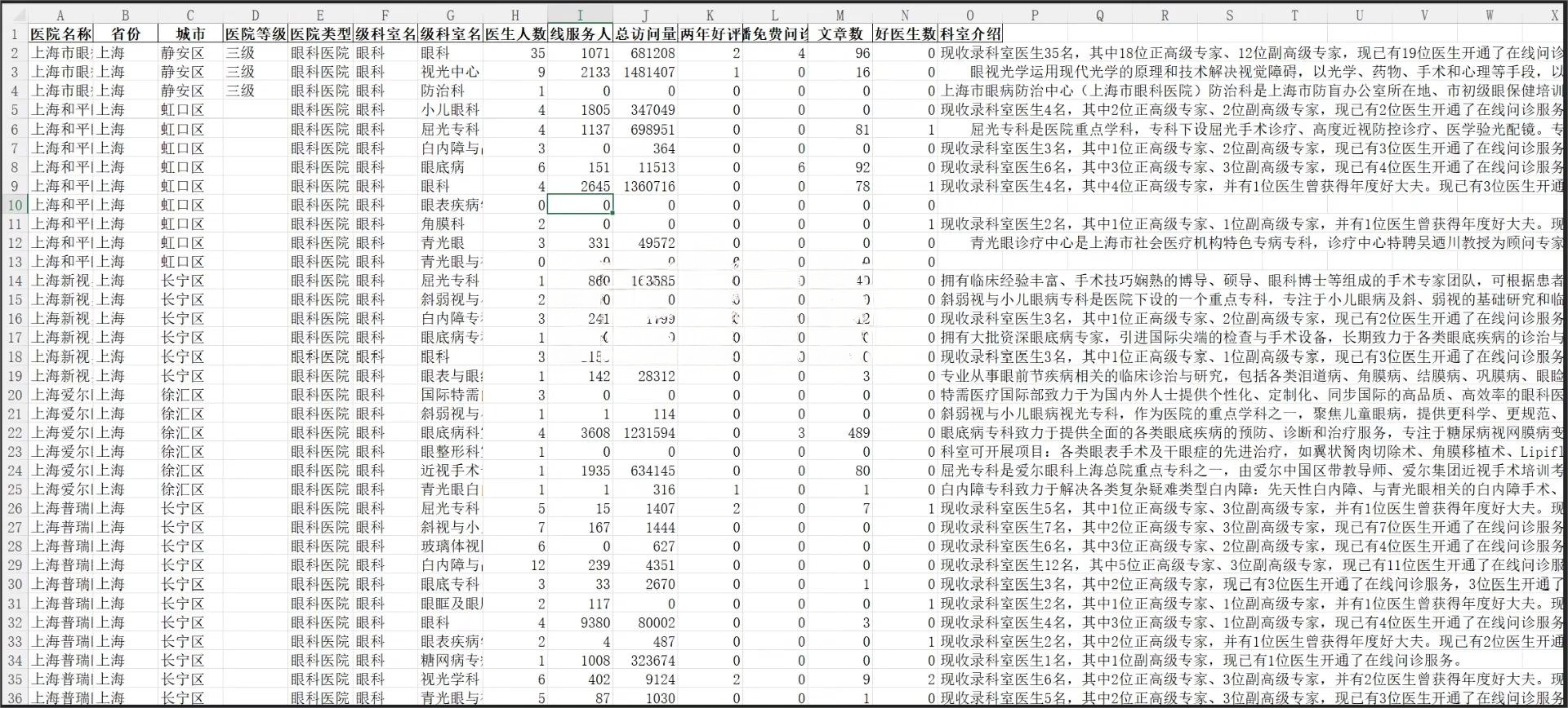 本数据库涵盖全国 10077 家医院,同步收录近 16 万条各医院二级科室介绍信息,核心内容包含医院名称、一级科室、二级科室、省份城市、医院等级、医院类型、科室医生人数、好评评级数及科室文字介绍等关键信息,数据维度全面,可充分满足精准查询与分析需求。 具体涵盖科室包括:专科 / 专病护理、中医、中西医结合科、五官、传染、儿科、儿科学、其他科室、内科、口腔、外科、妇产科、妇产科学、康复、特色诊疗、皮肤美容、眼科、精神、职业病科、肛肠、肿瘤、胸科、血液、骨科。