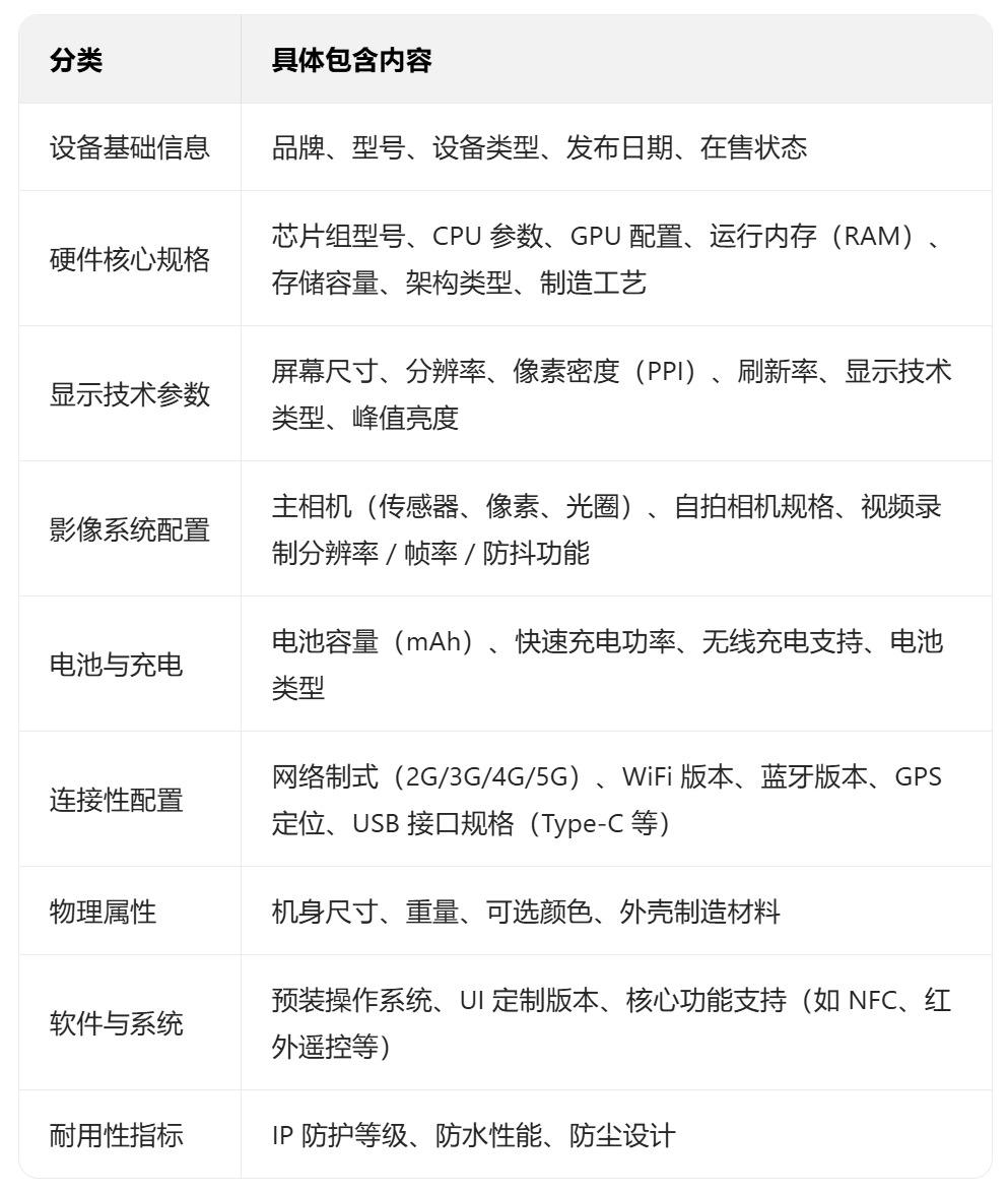 model: 具体型号,用于区分同一品牌下的不同产品,如 iPhone 15 Pro, Galaxy S24 Ultra, Redmi Note 13 等。